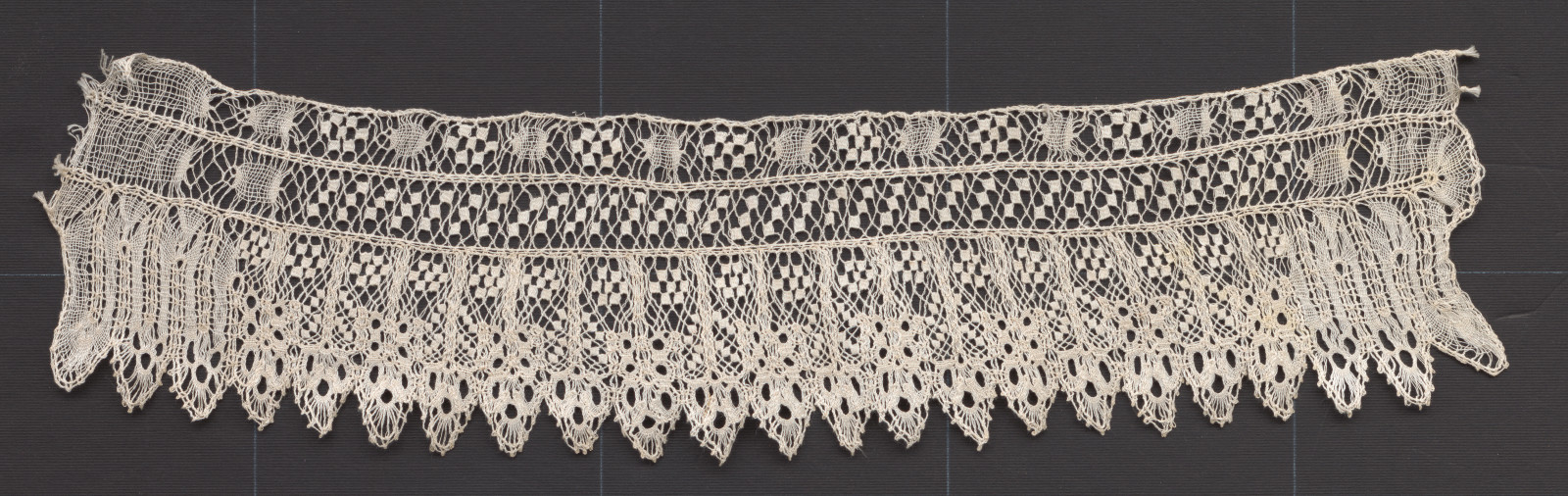 Paličkovaná čipka na čepiec. Čipka je vyrobená z bielych bavlnených nití na šitie, väzby plátenko, pletence, ploštičky, dierky, okraj tvoria zúbky.