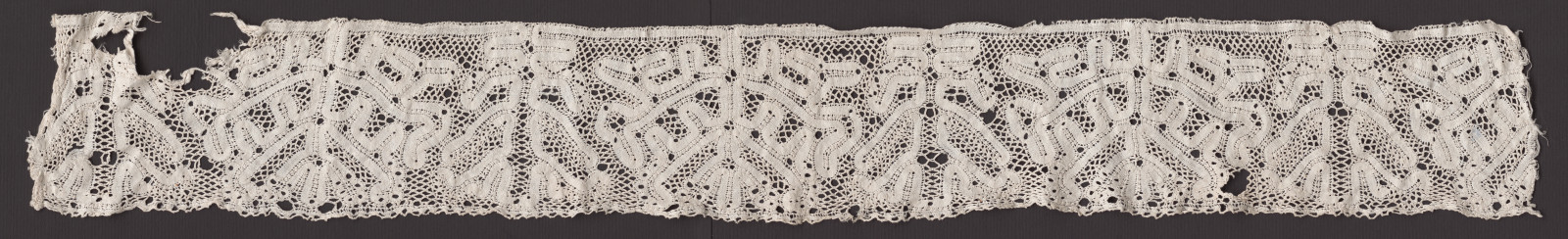 Pásiková paličkovaná čipka, typ gemerský. Materiál tenké biele ľanové nite, väzby hladké plátenko, jednopárový a dvojpárový pletenec, oká, motív rastlinný.