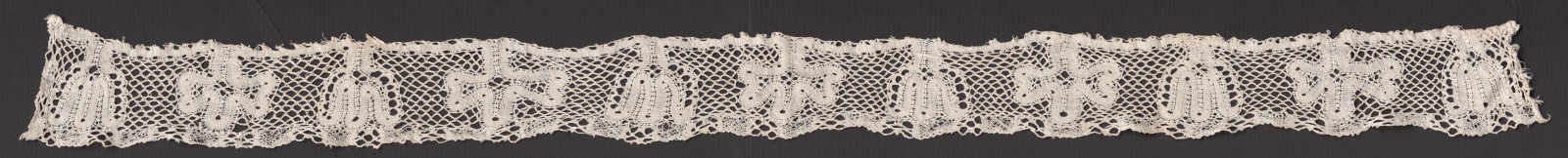 Pásiková paličkovaná čipka, typ gemerský. Materiál biele ľanové niteo, väzby hladké plátenko, jednopárový a dvojpárový pletenec, oká. V riečičke sa striedajú dva rastlinné motívy.
