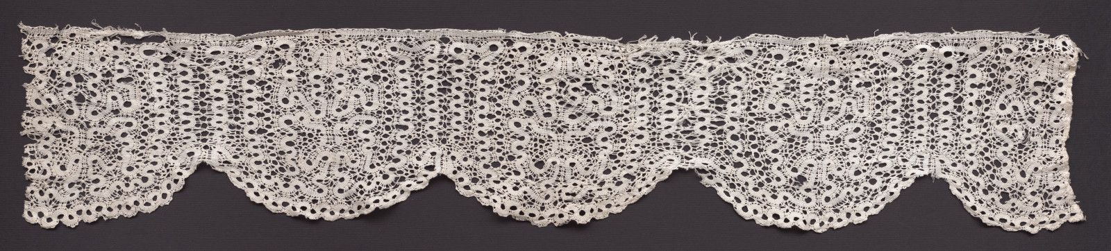 Pásiková čipka z kútnej plachty, typ slovenskogrobský. Zhotovená je z bielych bavlnených nití, tvarovaná do veľkých zubov. V každom zube je hadíkom vytvorený motív. Väzby plátenko, pletence, oká.