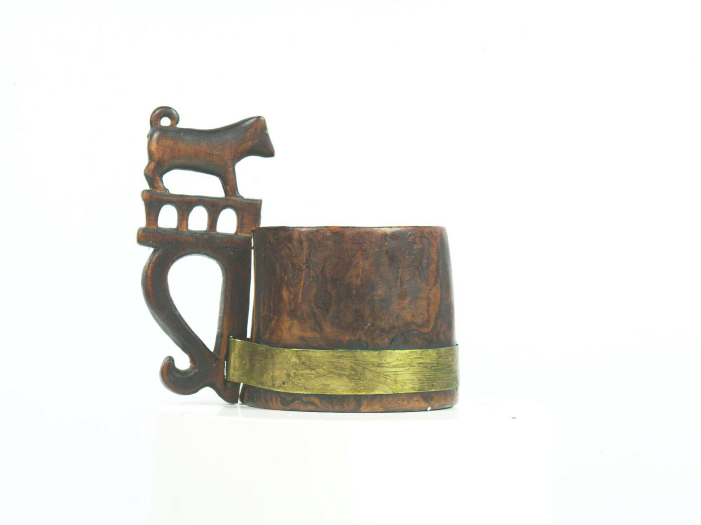 Drevená nádoba na pitie, pastierska. Valcovité telo mierne sa zužujúce smerom hore. Ozdobne vyrezávané ucho je v hornej časti nasadené na okraj tela, v spodnej časti je k nemu pripevnené mosadzným obvodovým pásikom. Ucho je ozdobne profilované, v hornej časti s plastikou psa, stojaceho na arkádovom mostíku. Črpák stredoslovenského typu.