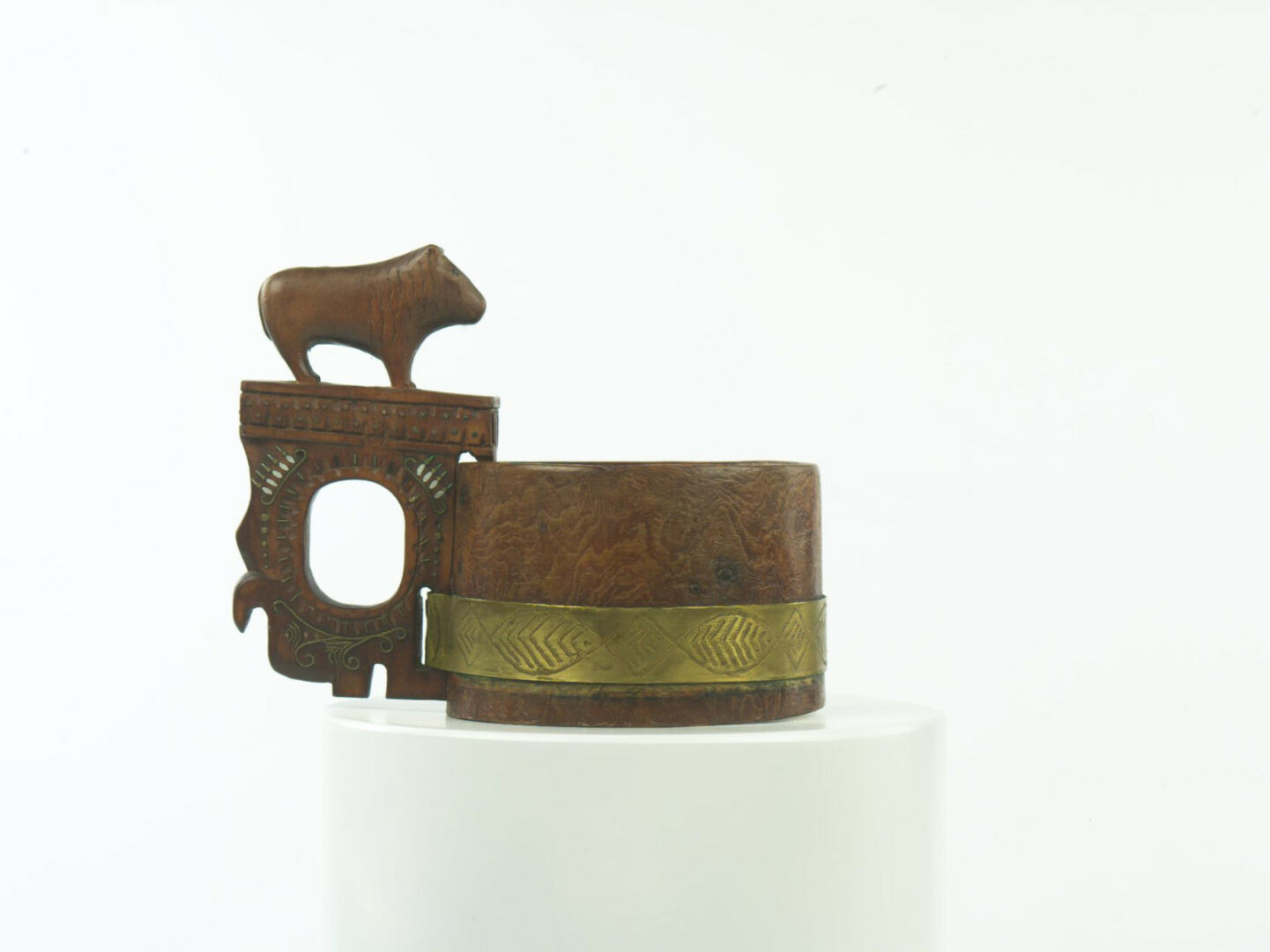 Pastierska drevená nádoba na pitie so vsadeným dnom. Telo nádoby valcovitého tvaru, na jeho horný okraj je upevnené mohutné ucho ozdobne vyrezávané a vybíjané mosadznými klinčekmi, drôtom a drobnými hliníkovými „šošovkami“. V hornej časti ucha je vyrezaný lev.Spodná časť ucha je k nádobe pripevnená mosadzným obvodovým pásikom s vybíjanými geometrickými ornamentálnymi motívmi.