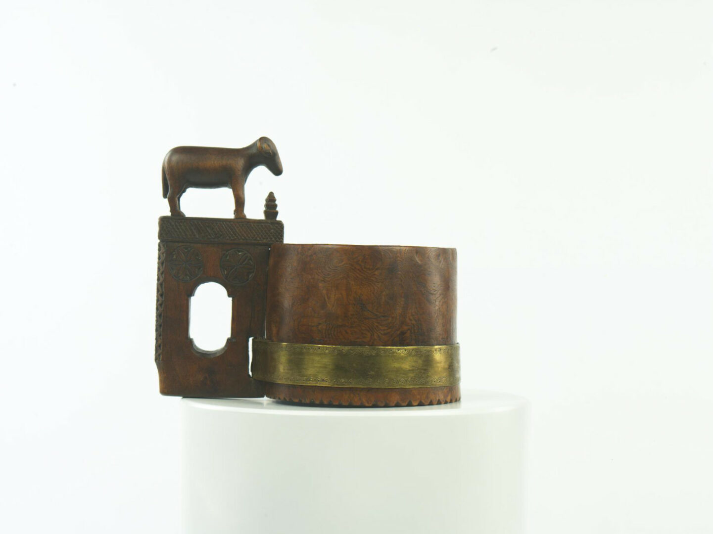 Drevená pastierska nádoba na pitie, telo nádoby valcovité vyrezané zo svoru, ucho ozdobne rezané s motívmi roziet, vo vrchole s plastikou barana. Na telo nádoby je v hornej časti nasadené, v spodnej časti je k nemu pripevnené obvodovým mosadzným pásikom s vybíjanou bordúrou.