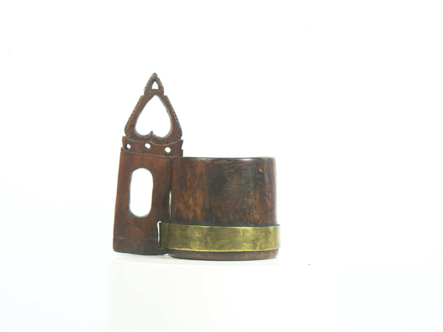 Drevený črpák s korpusom elipsovitého prierezu, so vsadeným dnom. Ucho v hornej časti zahaknuté cez okraj nádoby, v spodnej časti je prichytené ku korpusu prevlečeným mosadzným pásikom. V jeho strede je vyrezaný úchopný elipsovitý otvor, horná časť ozdobne vyrezaná v tvare obráteného srdca so srdcovitým výrezom vnútri, s ryhovanými vonkajším okrajmi.