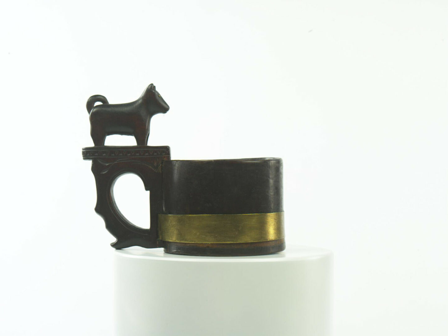 Drevená nádoba na pitie, telo valcovitého tvaru, na horný okraj je nasadené ucho skromne ozdobne vyrezávané s geometrickými a rastlinnými ornamentálnymi motívmi. V jeho vrchole je štylizovaná plastika psa.