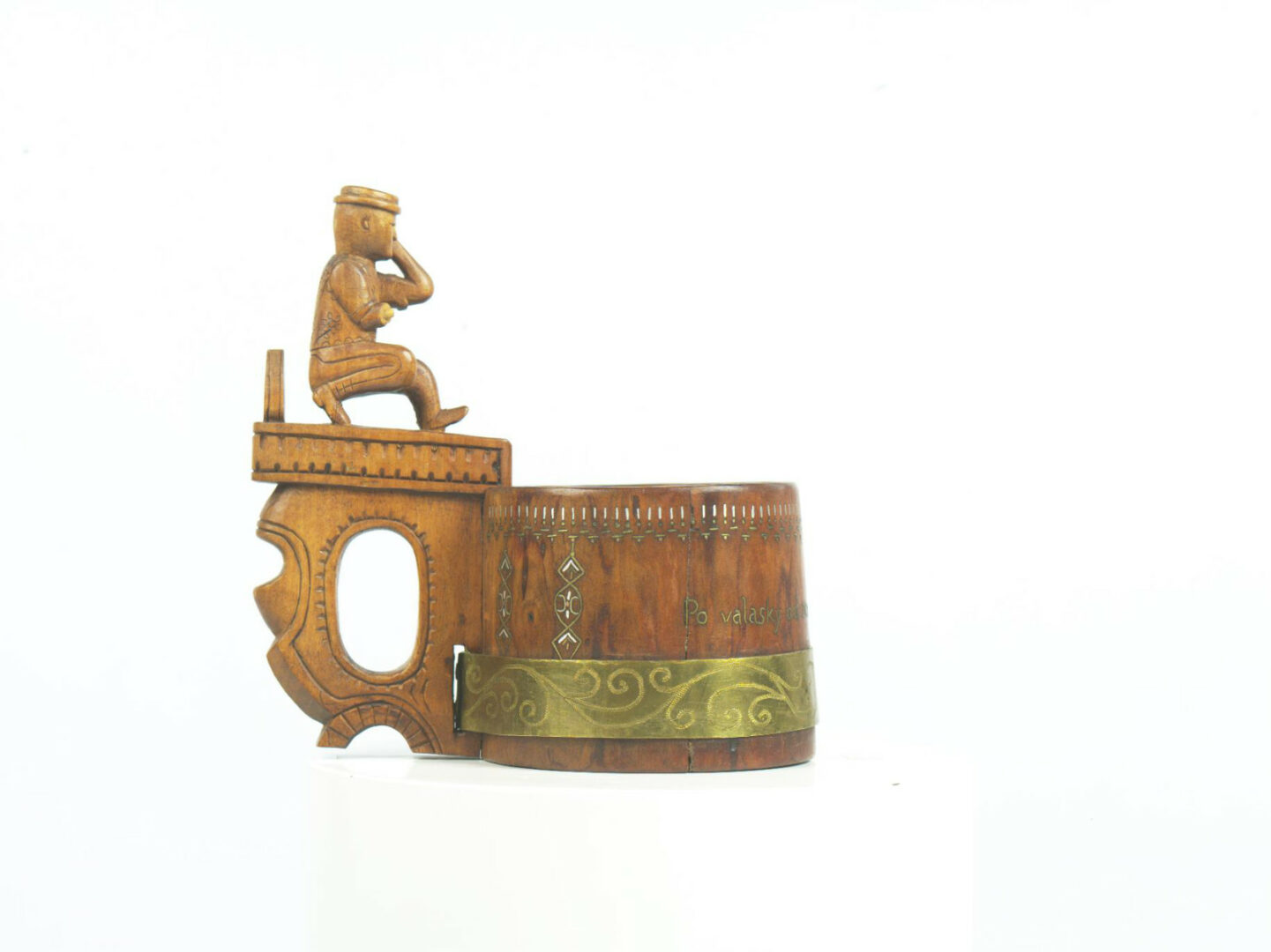 Drevená nádobka na pitie, kruhového prierezu, mierne dolu sa rozširujúceho tvaru s vsadeným dnom. Ucho nasadené na horný okraj korpusu a v spodnej časti fixované prevlečeným mosadzným plechovým pásikom, obopínajúcim spodnú časť korpusu po obvode. Korpus je zdobený vybíjanými geometrickými ornamentálnymi motívmi po obvode vrcholu a po bokoch, v strede vybíjaný text „Po valasky od zeme, kdo mi kozy zaženie?“ Mosadzný upínací pásik zdobený vybíjanými meandrami. Vyrezávané ucho s oválnym otvorom v strede, na jeho vrchole vyrezaná mužská postavička, tancujúca kozáčika. Chýba pravá ruka. Črpák stredoslovenského typu.