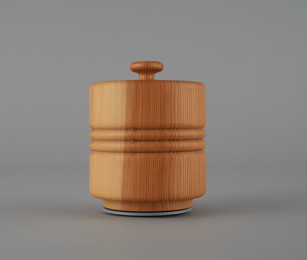 Drevená valcovitá nádoba s vrchnákom. Dóza je v strede zdobená troma rovnobežnými linkami. Prirodzená farba dreva dáva predmetu dvojfarebné sfarbenie.