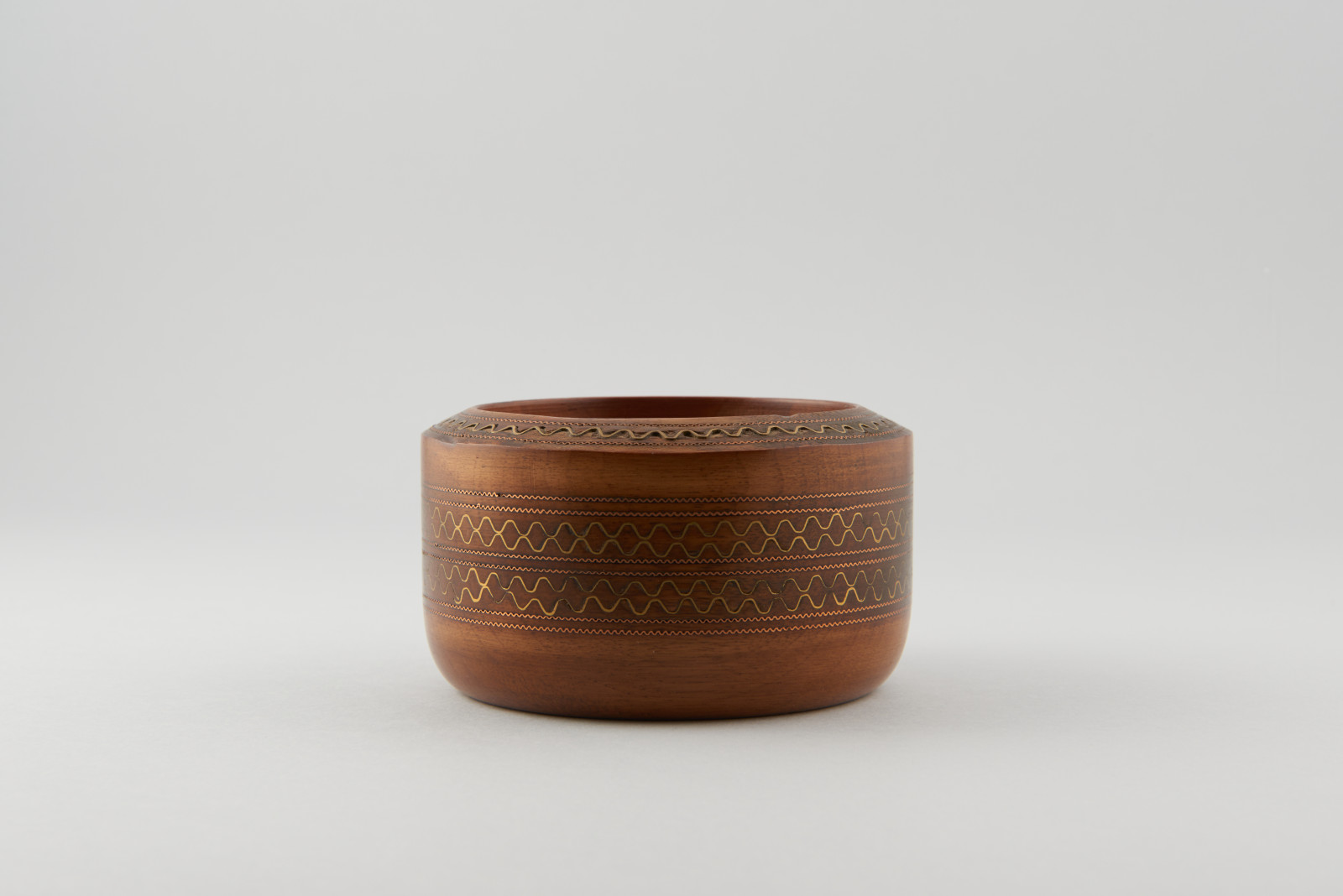 Dóza drevená, zhotovená sústružením, jednoduchý valcovitý tvar so zaoblenou hranou pri dne, okraj nádoby skosený. Celý korpus bohato zdobený vybíjaným vlnovkovitým vzorom z tenkého mosadzného plechu so striedajúcou sa hrúbkou. Rovnako zdobený je aj skosený okraj nádoby.