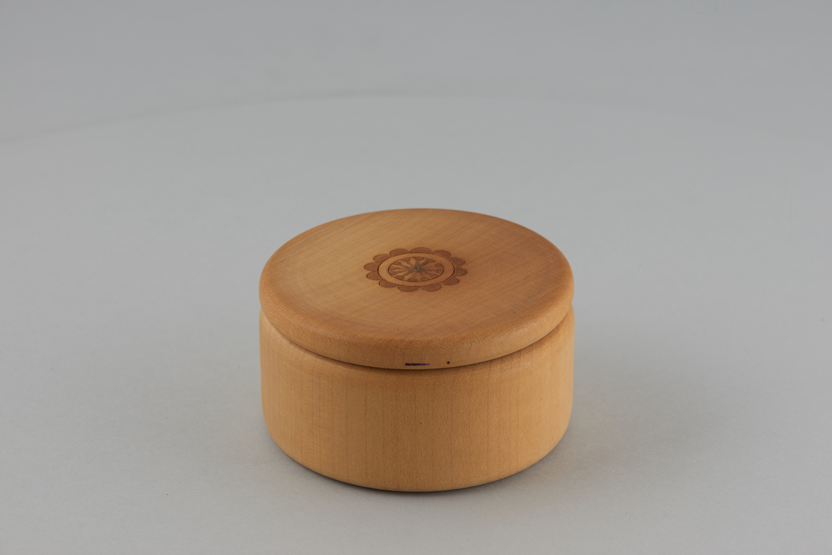 Dózička s viečkom, sústružená, valcovitého tvaru, hrany korpusu i viečka zaoblené, na ploche viečka v strede leptaný dekor v tvare štylizovaného kvetu.
