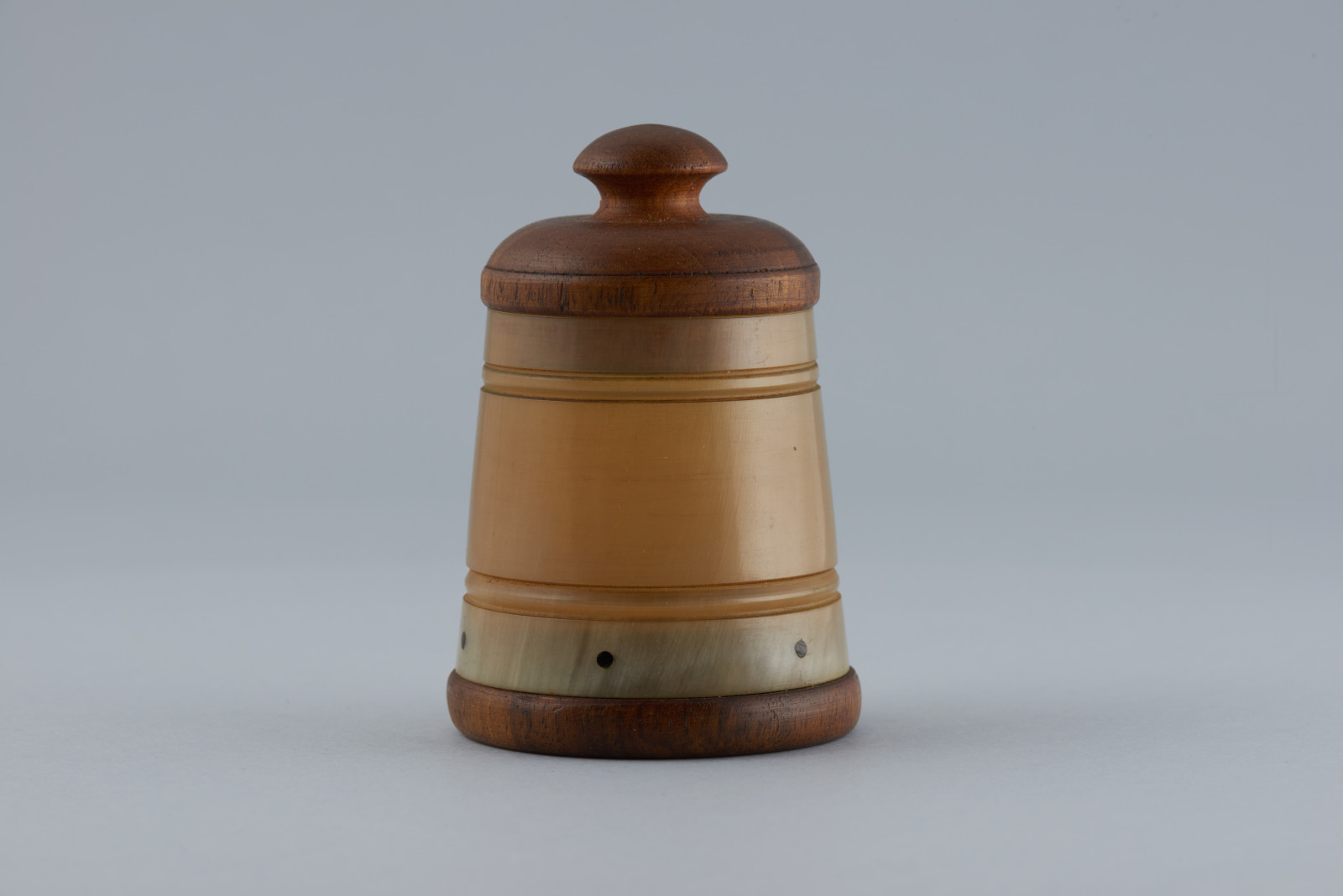 Dóza vyrobená z rohu hovädzieho dobytka, oválny tvar, ktorý sa smerom nahor trochu zužuje. Výzdobu tvoria 2 x 2 linky a bodky. Dno a vrchnák sú z dreva.