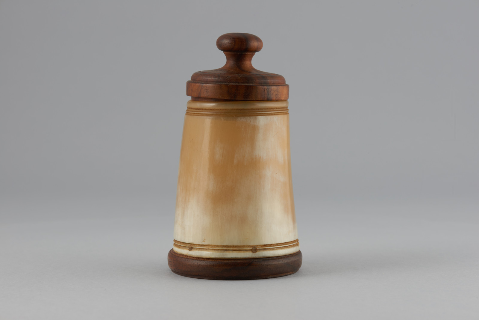 Dóza vyrobená z rohu hovädzieho dobytka, oválny tvar, ktorý sa smerom nahor trochu zužuje. Pri hornom a dolnom okraji vyryté linky. Dno a vrchnák sú z dreva.