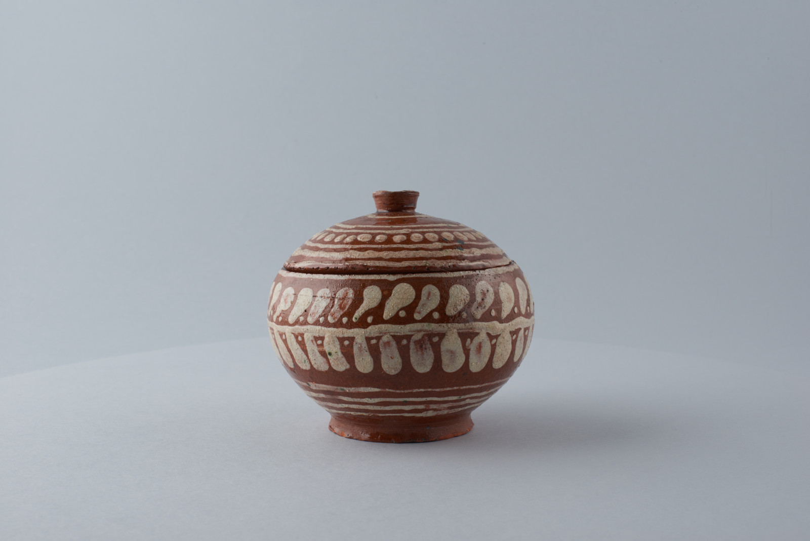 Dózička keramická, z červenej hliny, točená na kruhu. Nádobka sa skladá z dvoch častí, spodná časť a pokrievka s úchytkou. Dekor: po obvode pás s lískami, na pokrievke pásiky a bodky. Farebnosť: biely dekor na hnedočervenom podklade. Biela priehľadná glazúra.