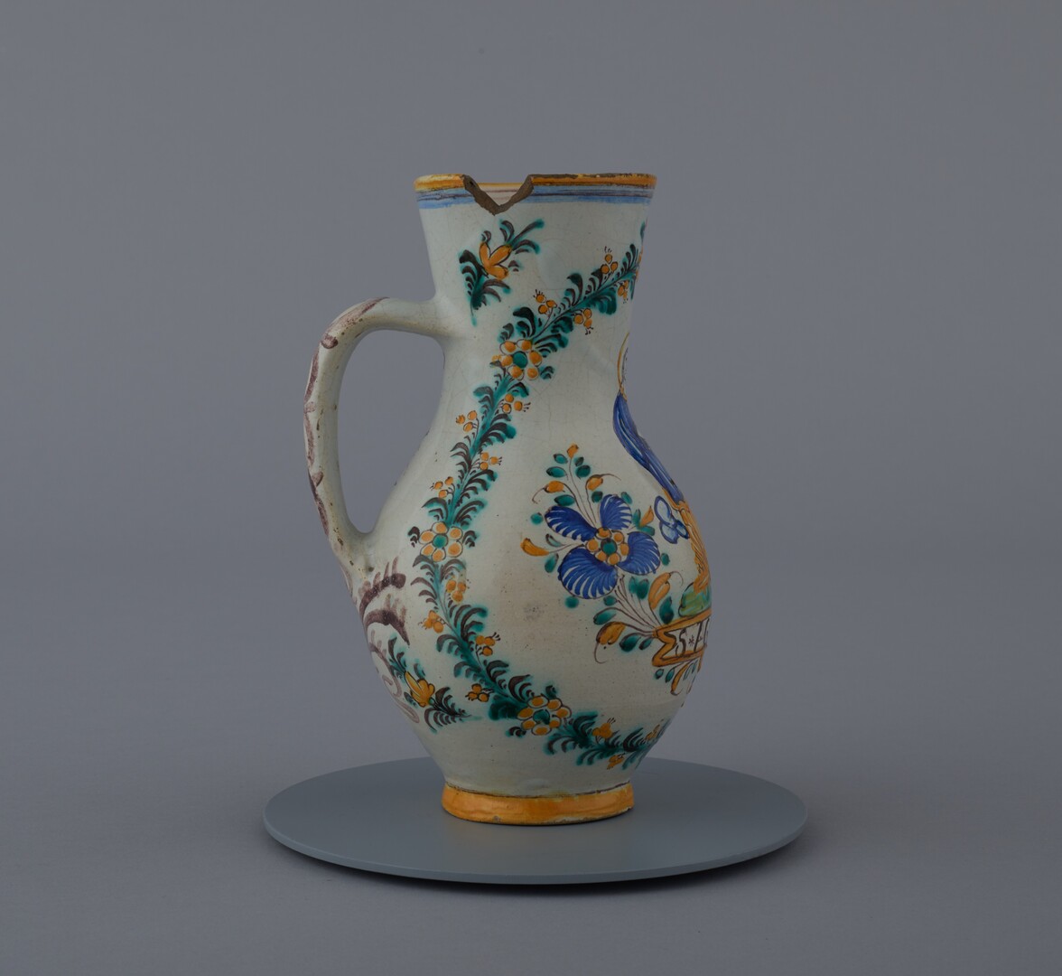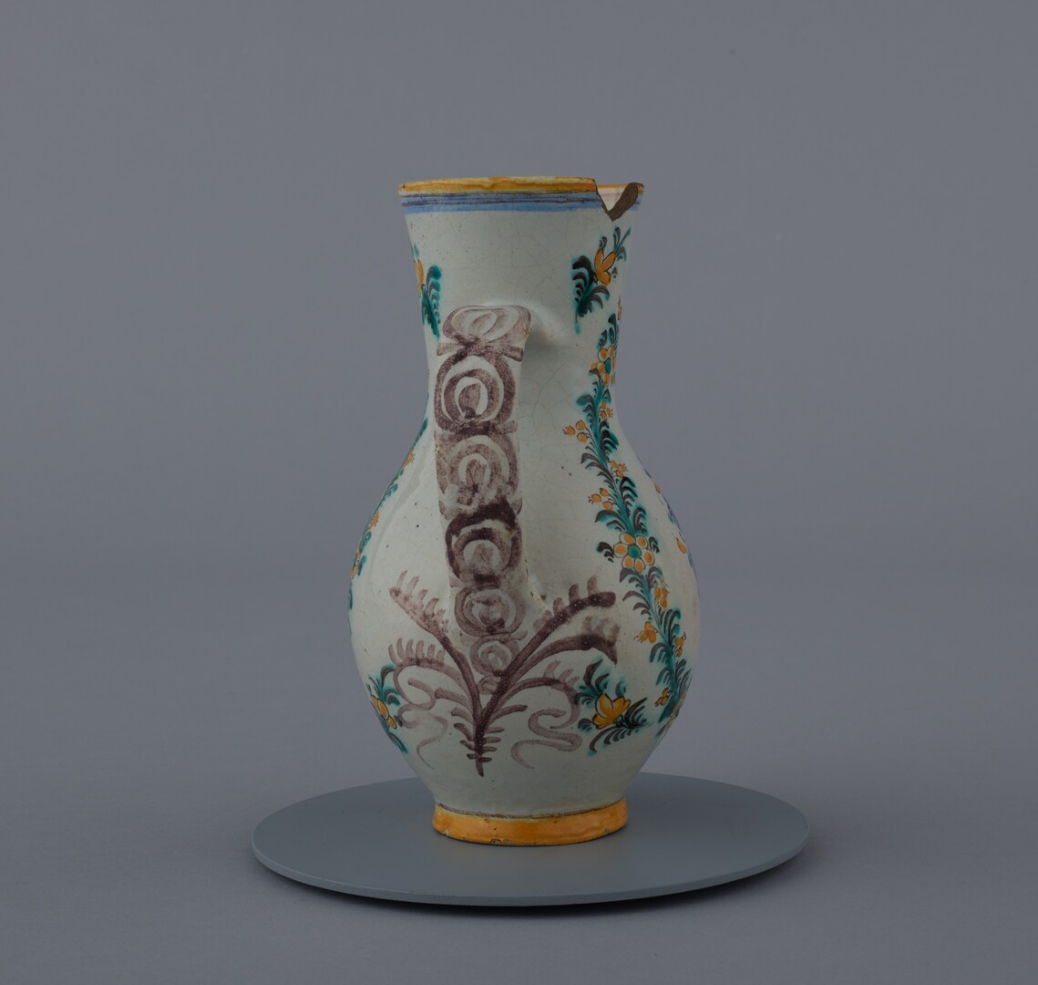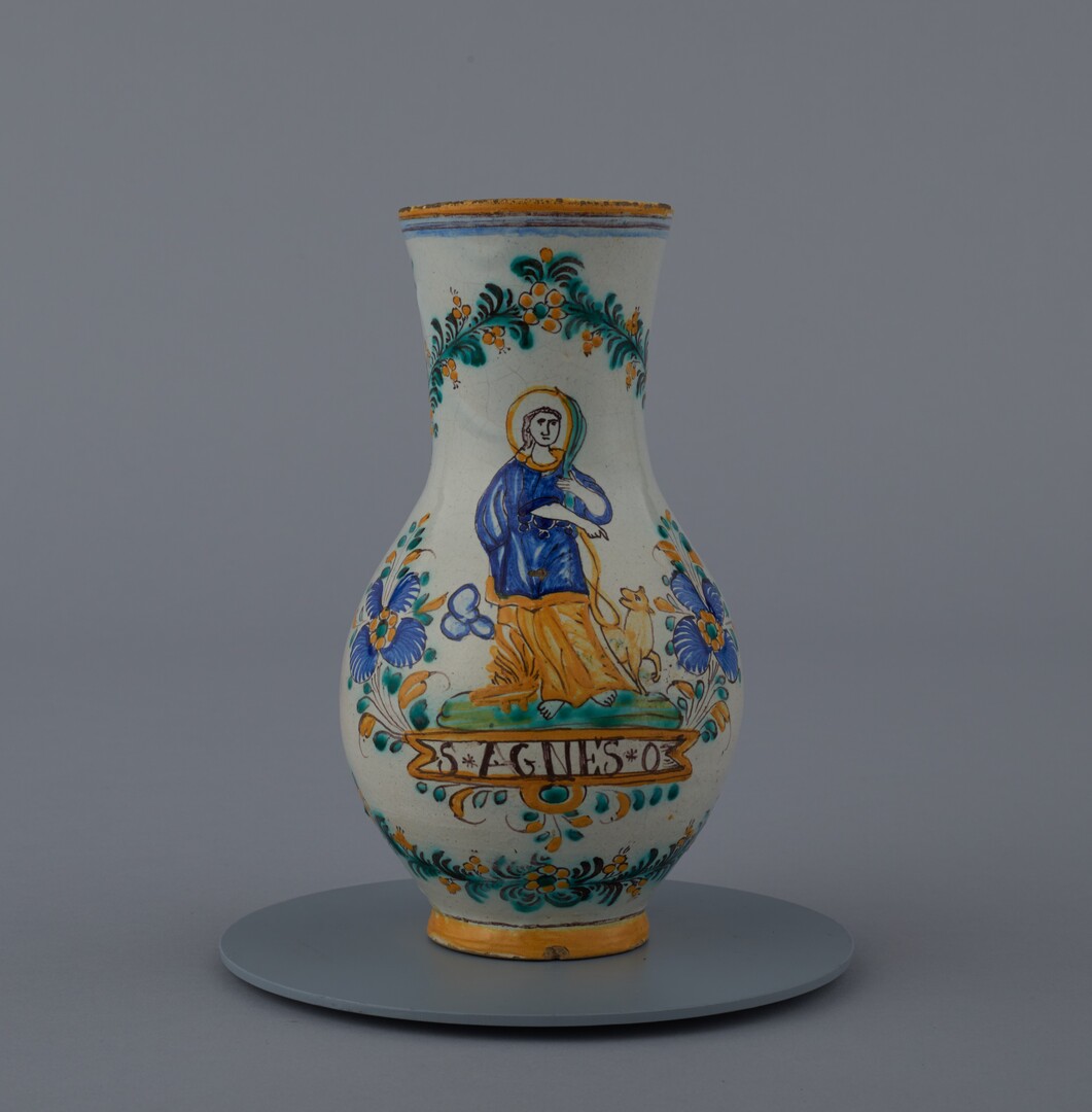 Džbán fajansový, z bledej hliny, točený na kruhu, najširšia výduť v dolnej tretine výšky, guľaté brucho, úzke hrdlo, ucho vychádza zo steny hrdla. Dekor: centrálne postava svätice so psom, dva veľké lupeňové kvety, okolo výjavu zelený veniec so žltými kvetkami. Farebnosť: dekor žltý, modrý, zelelný, hnedý. Biela podkladová glazúra. Nápis pod postavou: S*AGNES*O. Datovanie pod uchom: J *1861. Značenie na dne: ST.
