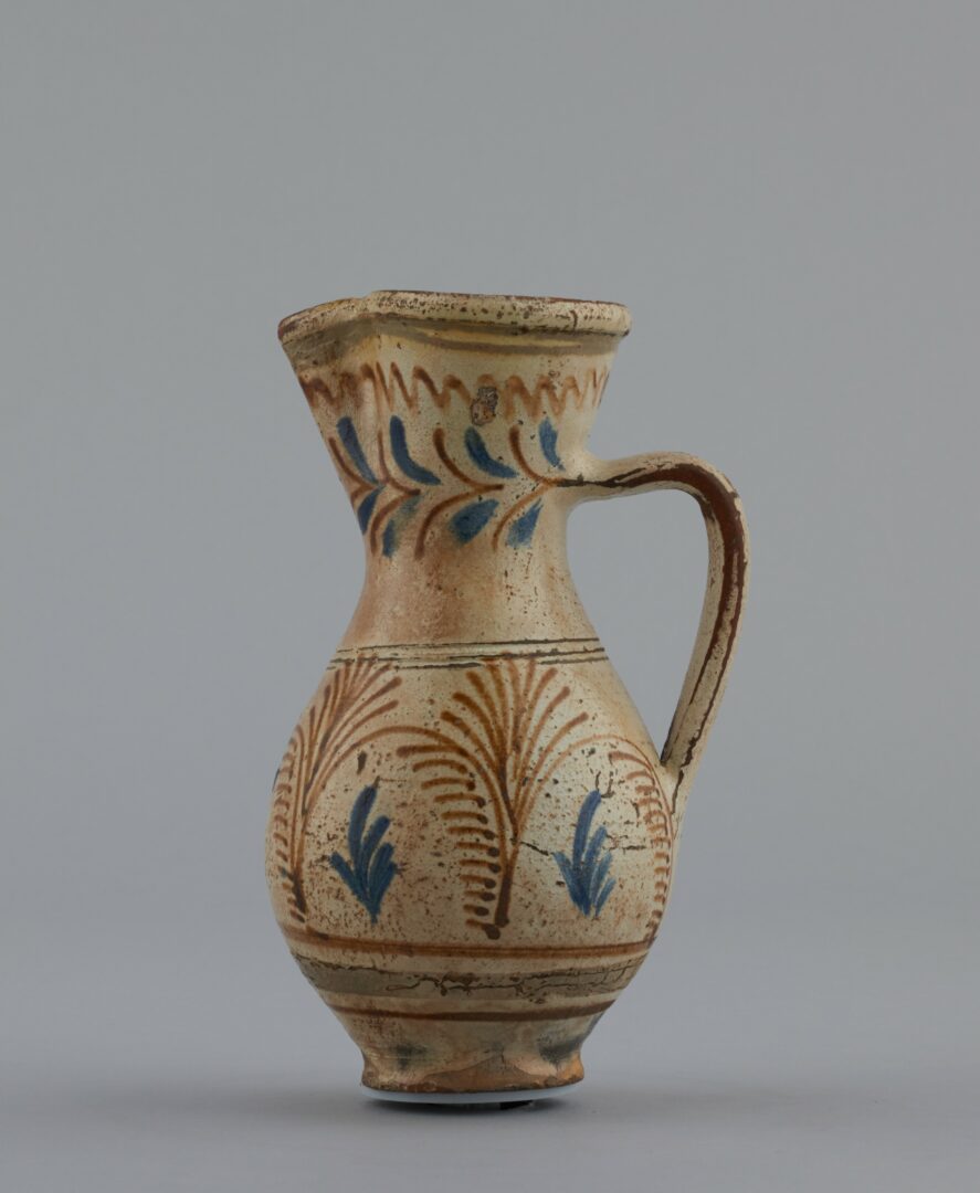 Džbán z červenej hliny, točený na kruhu. Dno úzke, najväčšia výduť stien v dolnej tretine výšky, hrdlo vysoké lievikovité, tvarované do nálievky, ucho vychádza zo steny hrdla. Dekor: črep obliaty bielou engobou, maľovaný dekor na hrdle vlnovka a pás z lístkov, na bruchu nádoby oblúky a lístky /palmety/. Farba dekoru: modrá, hnedá. Bezfarebná glazúra. Poškodený (odretá farba, glazúra).