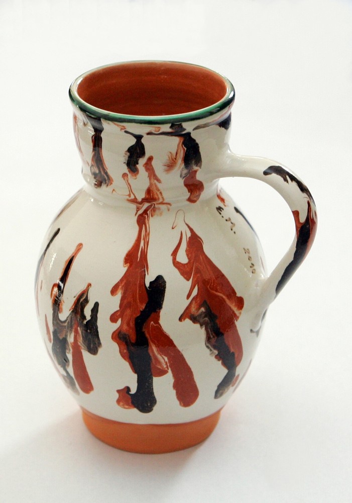 Ručne točený na hrnčiarskom kruhu, poliaty bielou engobou, zdobený fŕkaním farebných hliniek – engob, zvnútra aj zvonkatransparentná bezfarebná glazúra.