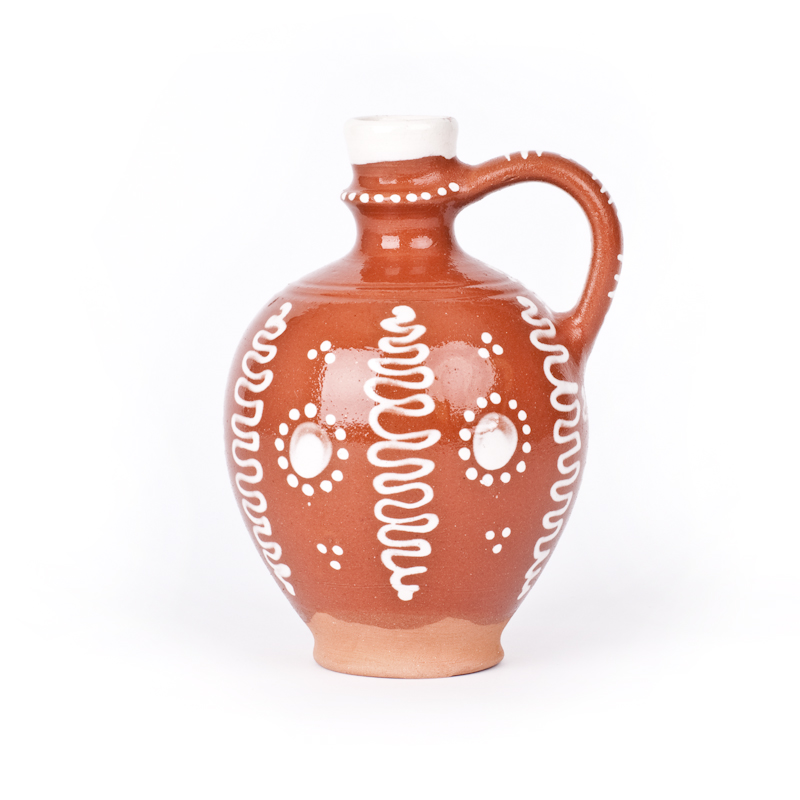Ručne točený na hrnčiarskom kruhu, poliaty tčervenohnedou hlinkou, zdobený geometrickým dekorom bielou hlinkou, transparentná bezfarebná glazúra.