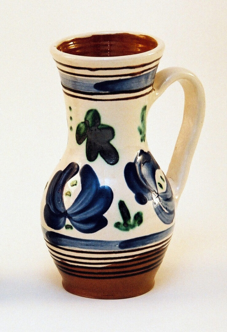 Ľudovo sa podľa tvaru nazýva sedliacky džbán. Ručne točený na hrnčiarskom hruhu, ucho lepená šlikrom, zvonka poliaty bielou hlinkou, maľovaný rastlinný veľkoplošný dekor štetcom, transparentná bezfarebná glazúra.