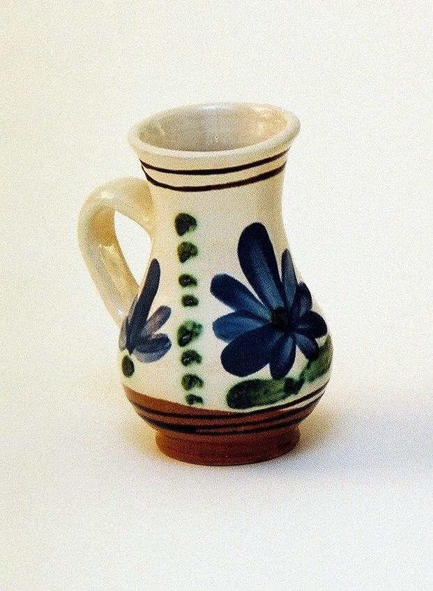 Ľudovo sa podľa tvaru nazýva sedliacky džbán. Ručne točený na hrnčiarskom kruhu, ucho lepené šlikrom, poliaty bielou hlinkou, maľovaný rastlinný veľkoplošný dekor štetco, transparentná bezfarebná glazúra.