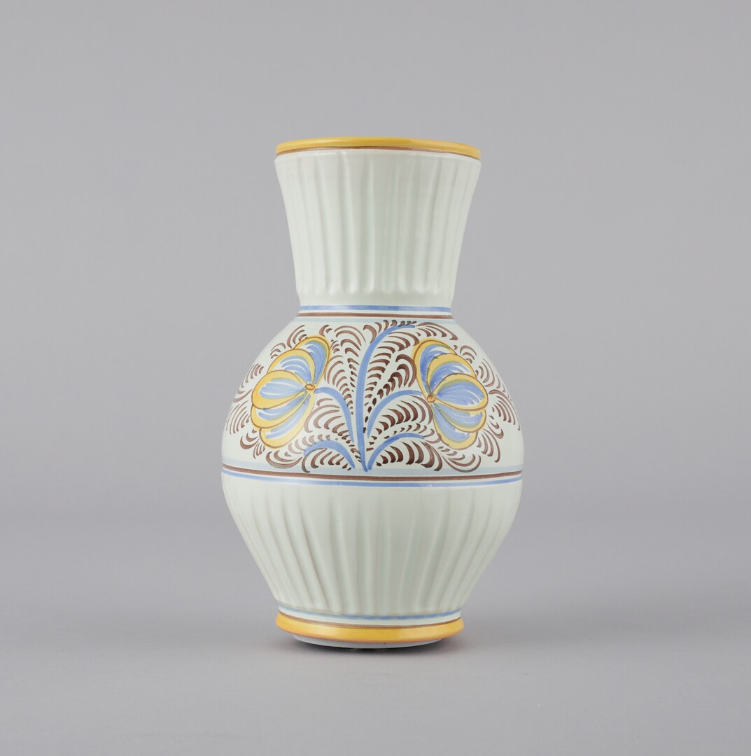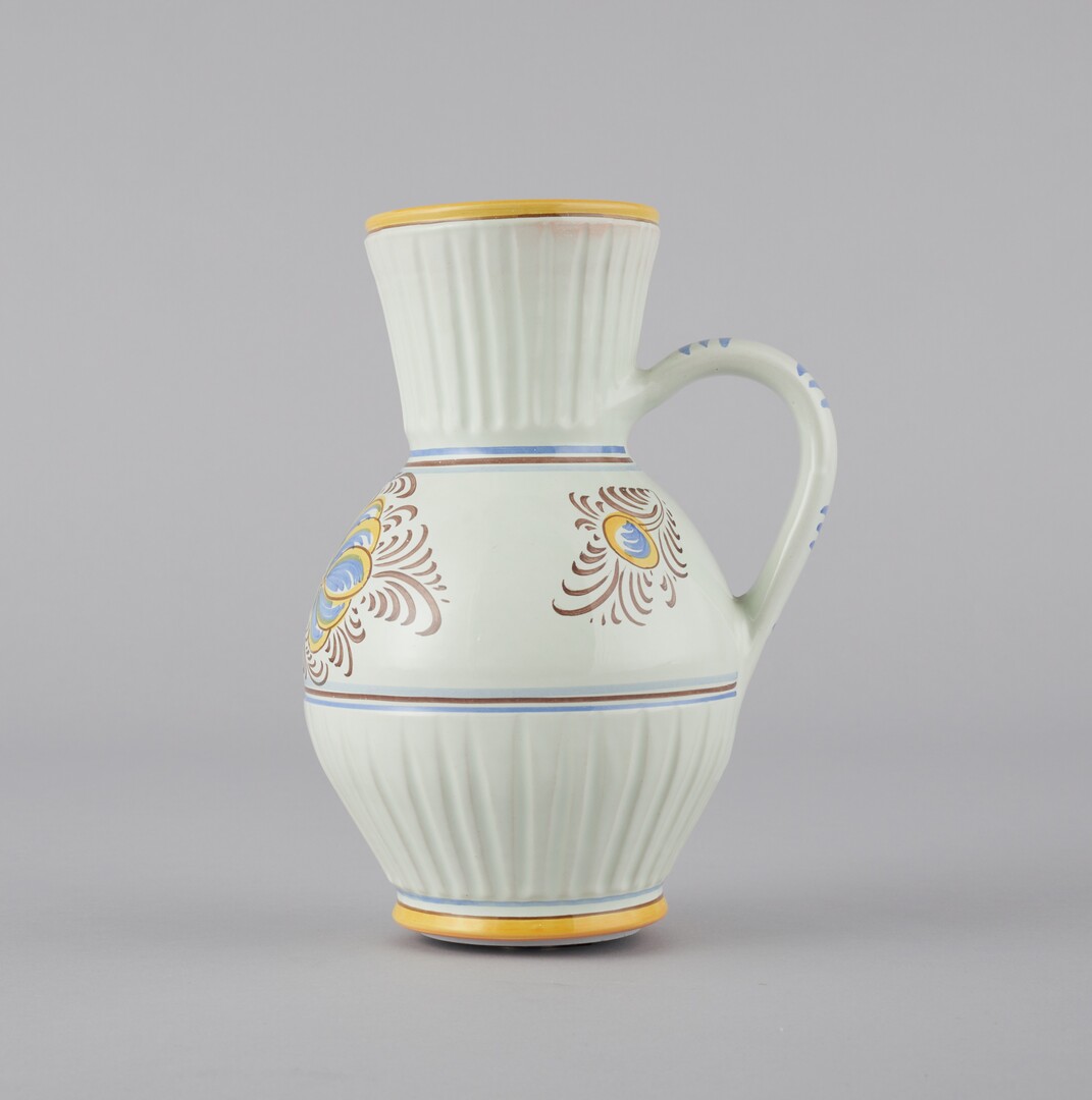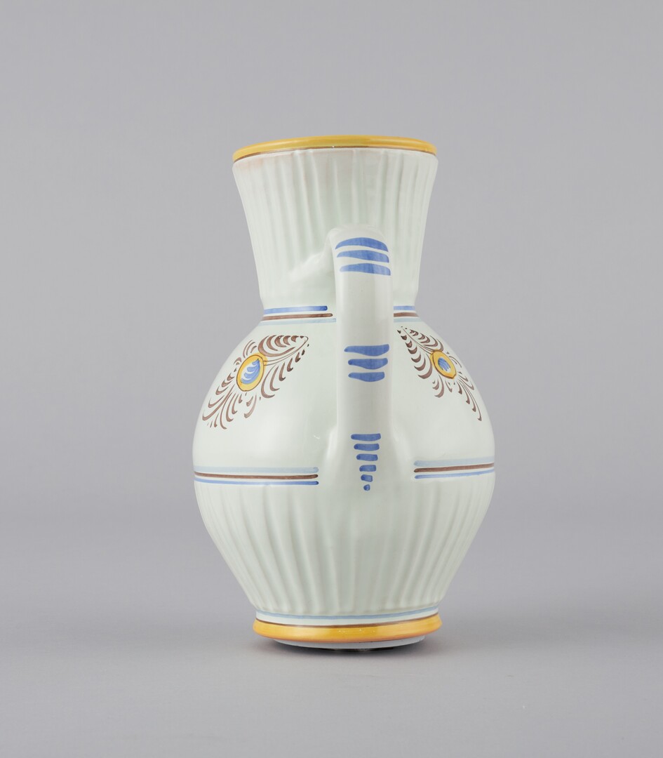 Džbán keramický, z červenej hliny, točený na kruhu, najširšia výduť v dolnej tretine výšky, zúžené kónicky sa rozširujúce hrdlo, ucho vychádza od okraja. Dekor: kanelovanie (zvislé ryhy na hrdle a dolnej časti brucha), maľovaný dekor: kytica s dvomi kvetmi s lístkami (mykáčiky). Farebnosť: modrý, žltý a hnedý dekor na bielej (krémovej) podkladovej glazúre. Značenie na dne: MODRA VR ML.