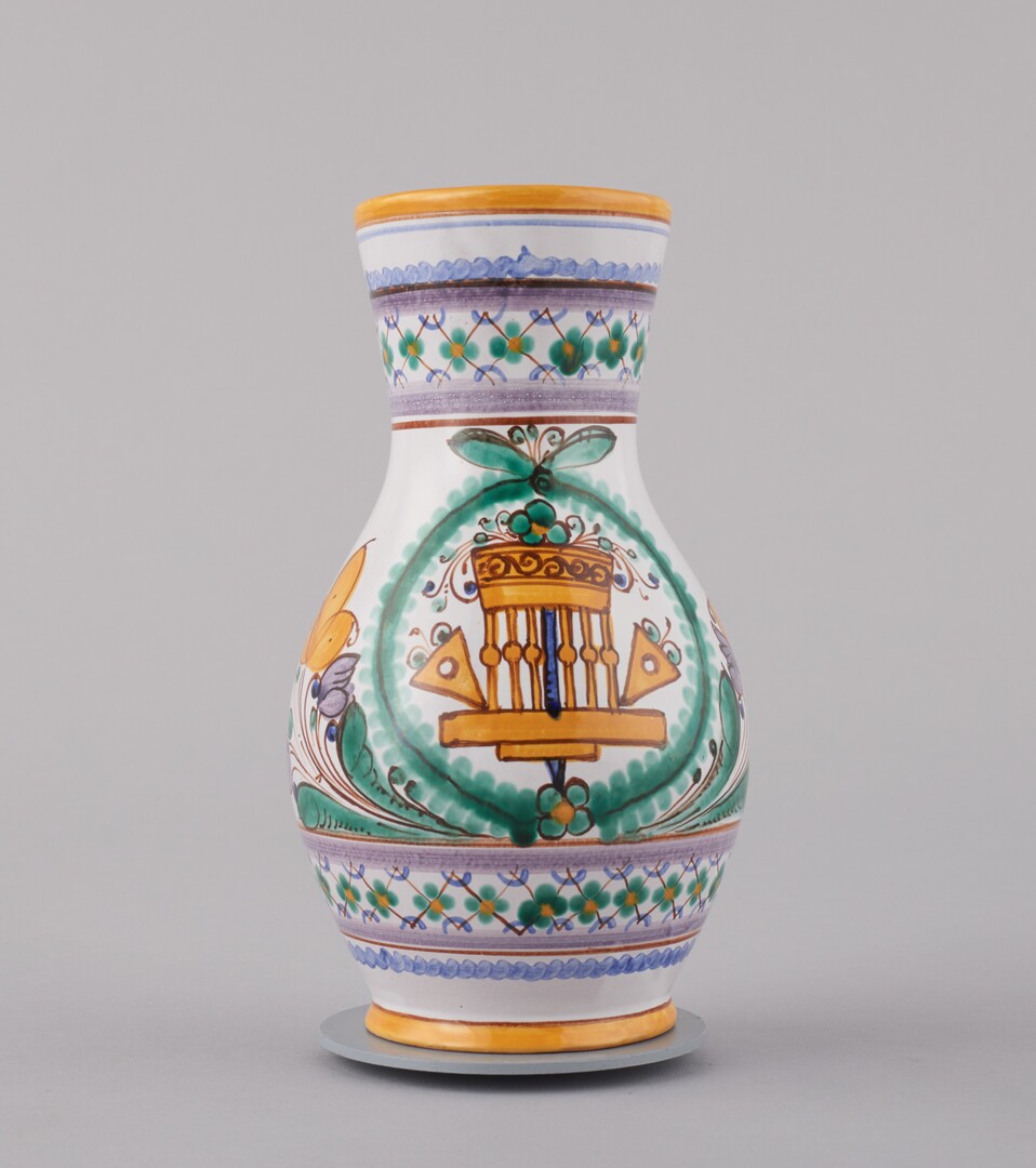 Džbán majolikový, z červenej hliny, točený na kruhu. Dekor: v strede džbankársky znak /hrnčiarsky kruh a náradie/ v zelenom venčeku, po stranách kvetinový dekor /tulipány/, pod hrdlom a v spodnej časti dekoratívny pás /bodky – štvorlístkové kvietky, čiarky, vlnovky/. Farebnosť: žltá, zelená, modrá, fialová, hnedá kontúra. Biela podkladová glazúra.