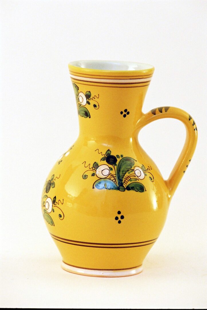 Ľudovo sa podľa tvaru nazýva sedliacky džbán. Džbán zvnútra vyliaty bielou cíničitou, zvonka žltou krycou glazúrou. Rastlinný dekor – zelený trojlístkový motív s dvoma bielymi pukmi a jedným modrým pukom okontúrované hnedou kontúrou rozložené v štyroch motívoch dva po bokoch a dva čelne na bruchu džbánu.Hrdlo, dno a spodná tretina džbánu okrúžkovaná bielou a hnedou farbou.