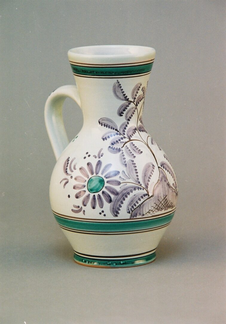 Kópia habánského džbánu datovaného okolo r. 1800 zo západného Slovenska. Ľudovo sa nazýva podľa tvaru sedliacky džbán. Džbán poliaty bielou cíničitou glazúrou do ktorej je centrálne maľovaný rastinný dekor – vetvička s fialovohnedými lístkami a po bokoch zeleno fialové margaréty. Hrdlo, dno a spodný okraj brucha nádoby sú okrúžkované.