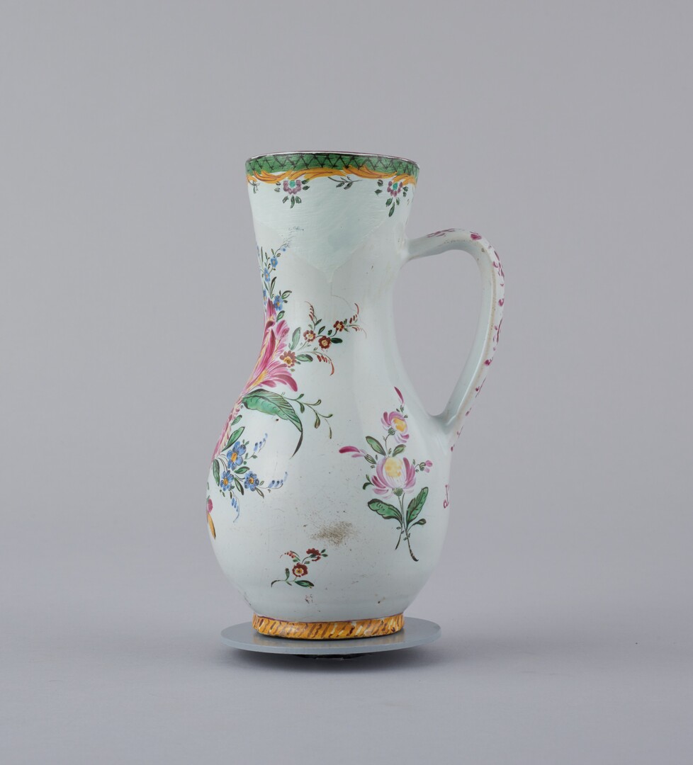 Džbán fajansový, z bledej hliny, točený na kruhu. Najširšia výduť v dolnej tretine výšky, guľaté bruško; úzke, kónicky sa rozširujúce hrdlo s rovným okrajom, ucho vychádza z hrdla. Dekor: centrálne bohatá kytica kvetov rokokového štýlu (ruže, tulipány, nezábudky a ďalšie). Pod uchom datovanie: 17 88. Bez značenia. Reštaurovaný stav: domodelovaná a domaľovaná časť hrdla.