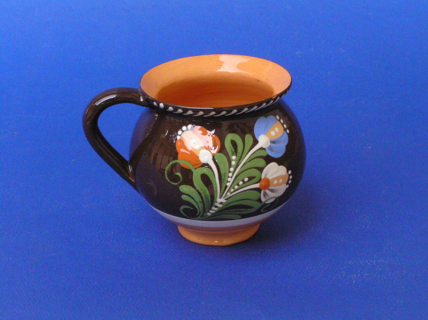 Ručne točený na hrnčiarskom kruhu, poliaty bielou, alebo tmavohnedou hlinkou, maľovaný farebnými hlinkami rastlinný, alebo geometrický dekor – rôzne varianty, transparentná bezfarebná glazúra.