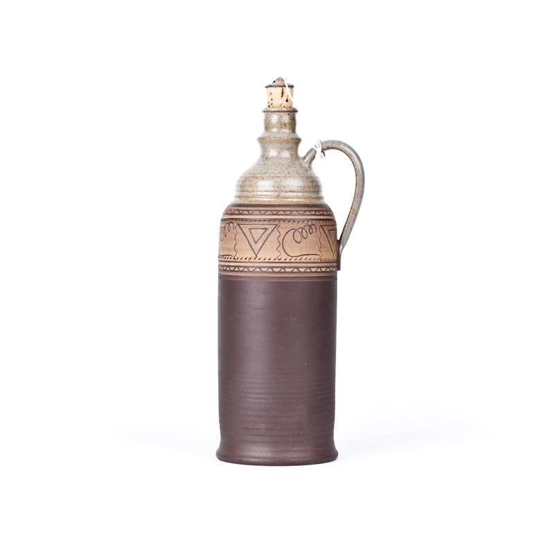 Ručne točená na hrnčiarskom kruhu z tmavohnedej (bielej) hliny, zdobená naneseným pásom bielej (červenohnedej, tmavohnedej) hlinky do ktorej je rytý geometrický dekor, na hrdle šedobéžová glazúra.