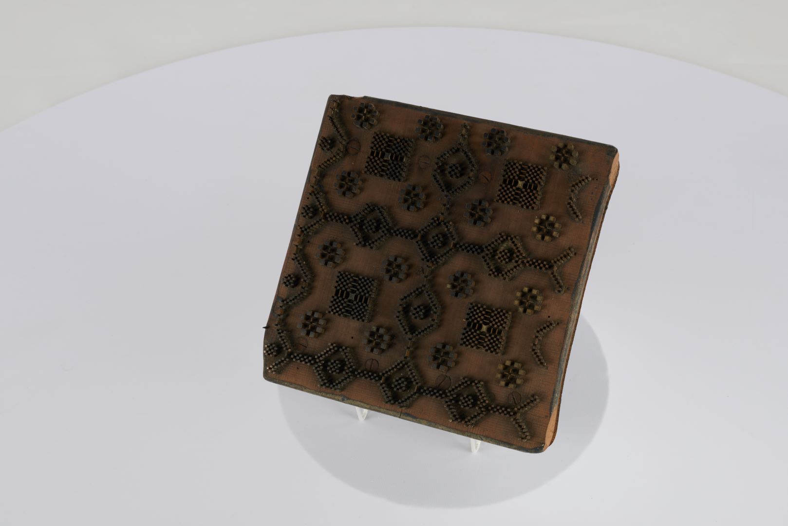 Forma na modrotlač, drevená, štvorcového tvaru. Lícová strana s pravidelnou výzdobou z kompozície geometrických ornamentálnych motívov z nabíjaných hranatých mosadzných klincov rôznej hrúbky. Forma zložená z dvoch dosiek, z ktorých rubová (zadná) má vydlabané dve „úchytky“ na držanie a manipuláciu.