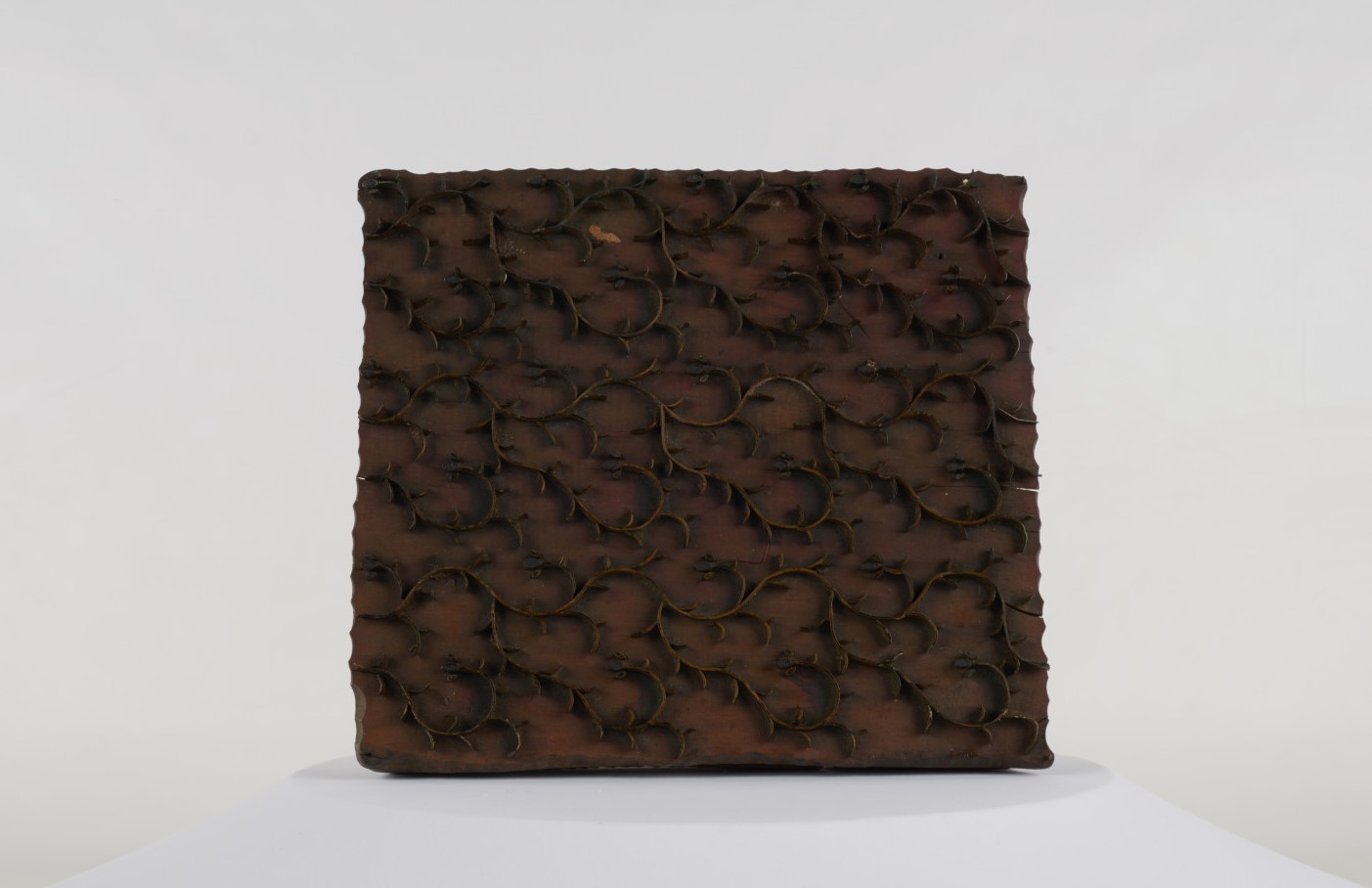 Drevená forma na modrotlač, vybíjaná mosadznými plieškami, štylizovaný rastlinný ornament. Vyrobená z hruškového dreva. Dielňa: bratia Trnkovci