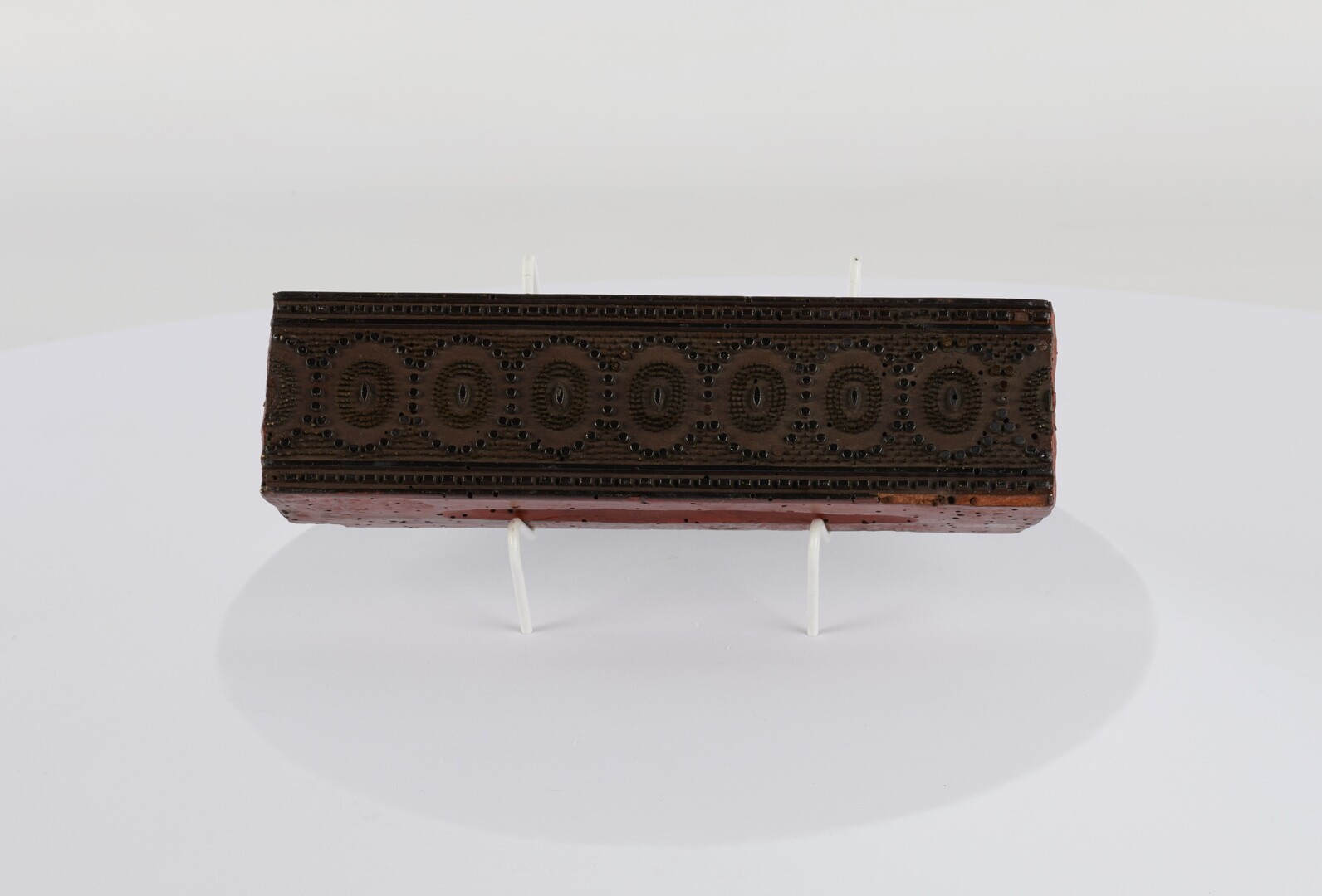 Drevená bordúrová forma obdĺžnikového tvaru. Výzdoba vybíjaná z mosadzných klinčekov v tvare celého radu identických sústredných oválov. Pozdĺžne strany lemované radom drobných obdĺžnikov medzi dvomi linajkami.