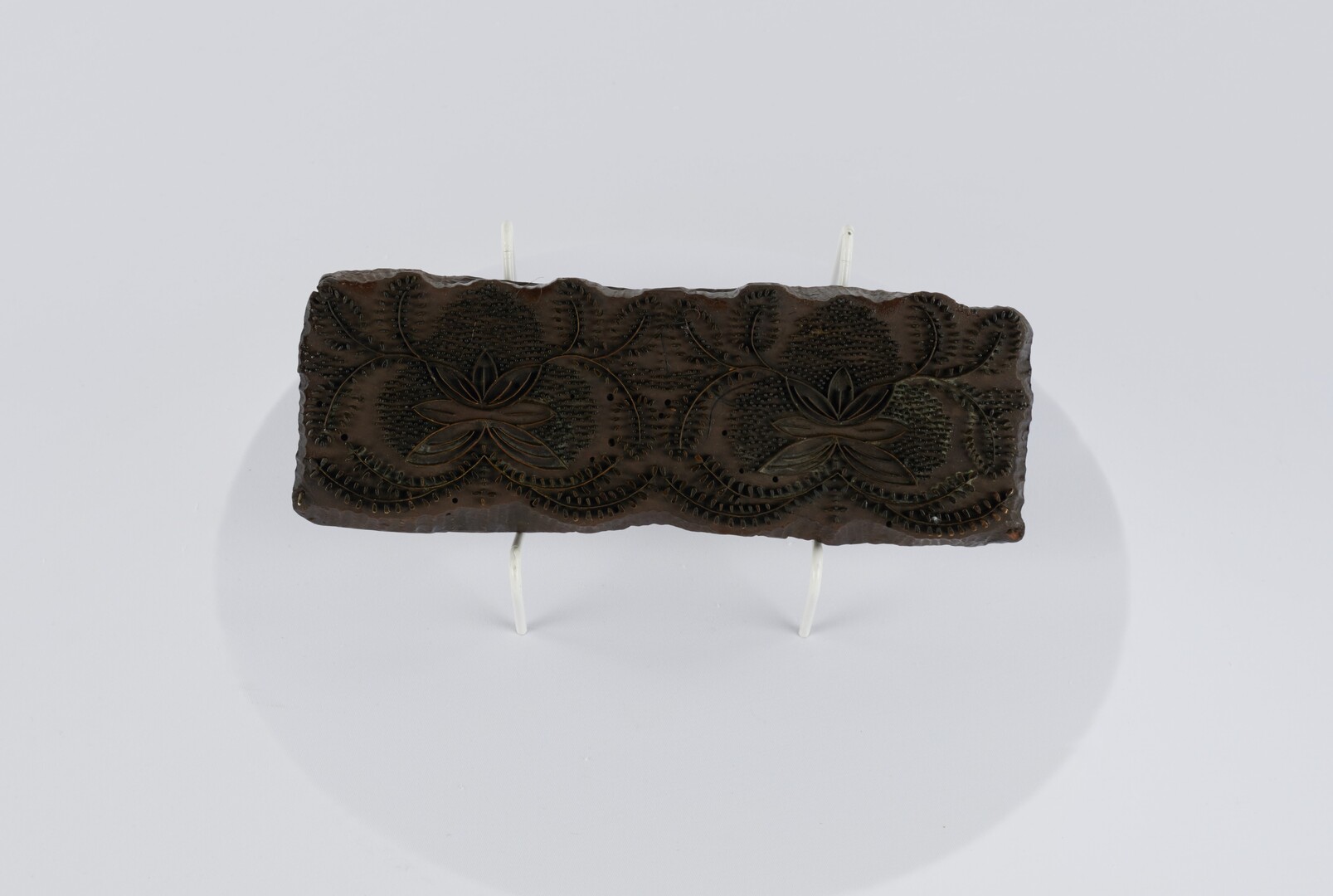 Drevená bordúrová forma obdĺžnikového tvaru s mierne zvlnenými stranami. Hlavnú výzdobu tvoria dva identické sedemlístkové kvety vedľa seba, z ktorých vedú stonky s bodkovanými lístkami. Okolo kvetov sú v hustej nepravedelnej formácii nabité klinčeky, ktoré kvetom robia akési “palmetové” pozadie. Dekor je zhotovený z nabíjaných mosadzných plieškov a klinčekov.