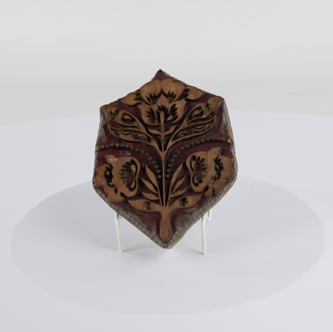 Drevená forma v tvare šesťuholníka, s jedným rezaným kvetinovým motívom, ktorý zaberá celú lícovú plochu. V hornej časti je široko rozvinutý kvet s bočnými dvojlístkami, v spodnej časti po bokoch stonky dva menšie kvety, ktoré sú od horného kvetu oddelené dvomi bodkovanými oblúkmi.