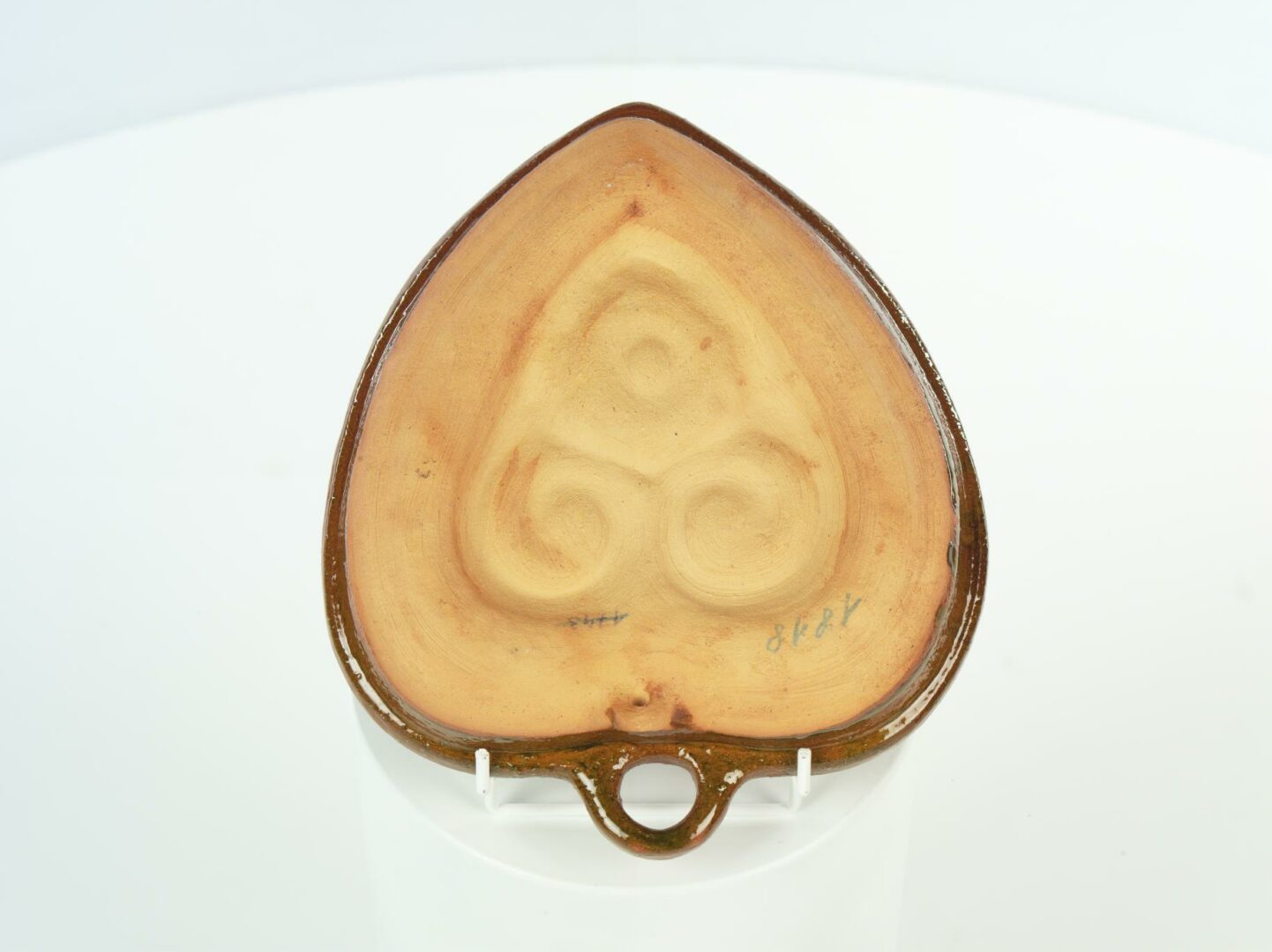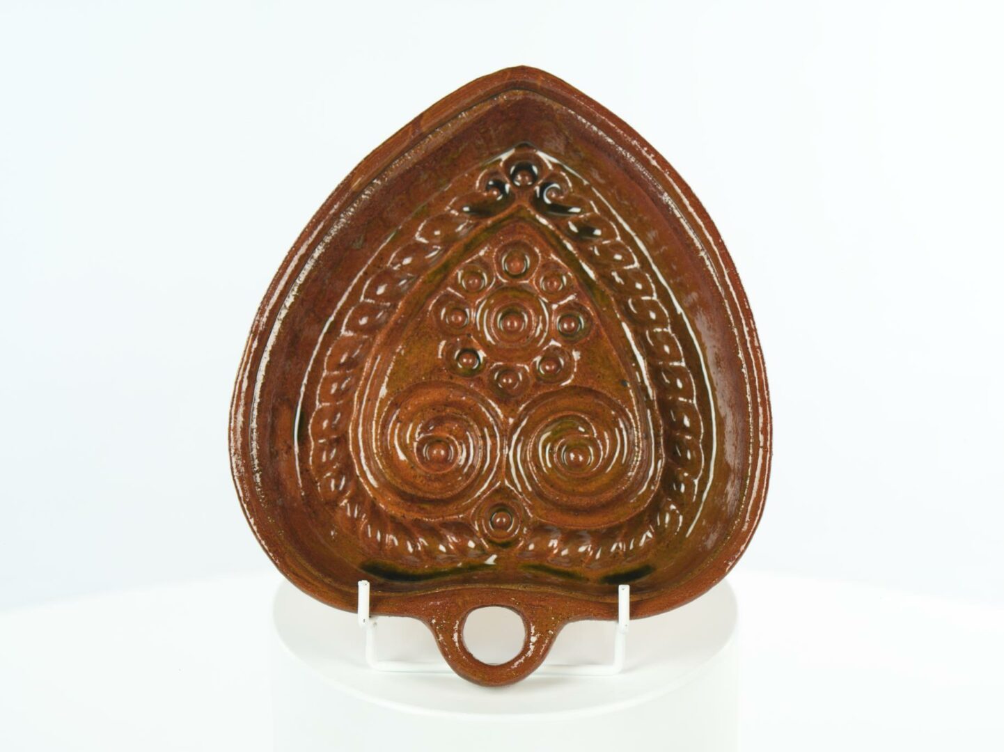 Forma na pečenie v tvare srdca, vo vnútri profilovaná – dekor, ktorý sa prenesie na pečený koláč (kvet, srdce). Forma má ucho na zavesenie. Hnedá glazúra vo vnútri, vonkajšia strana je bez glazúry.