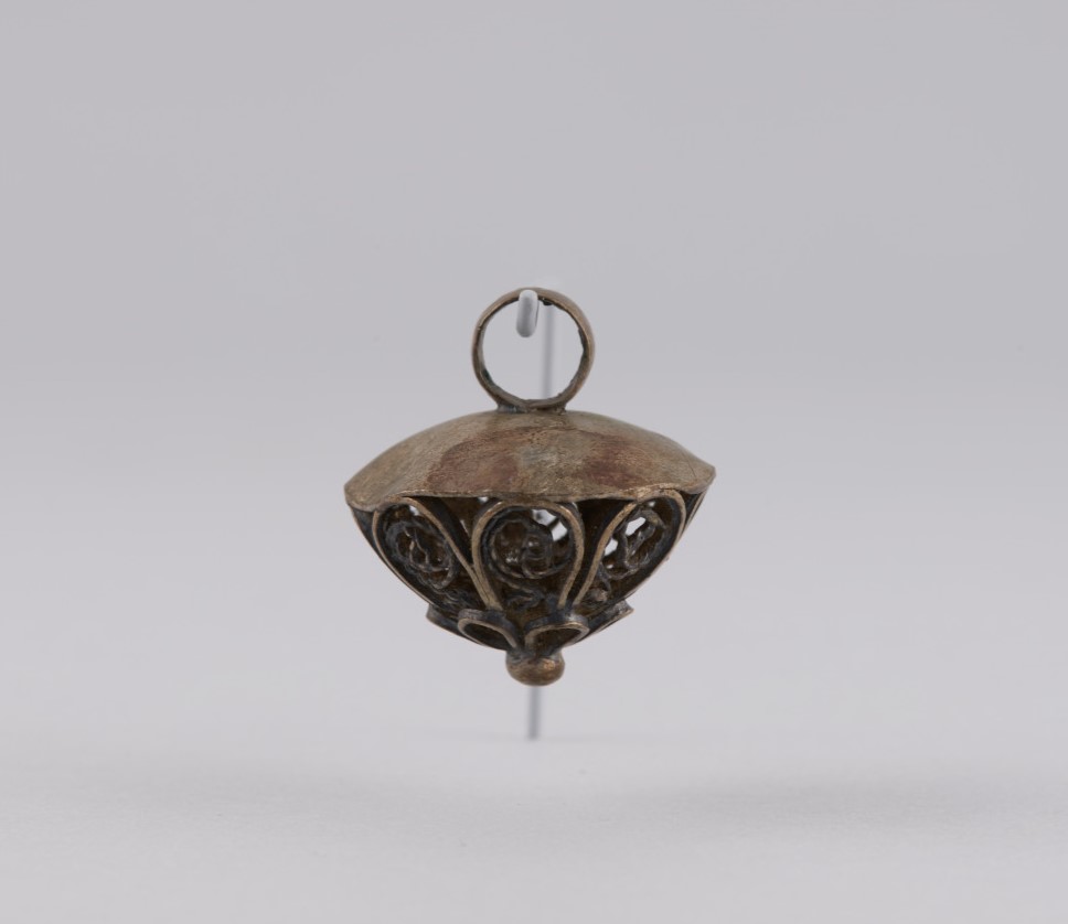 Gombík má pologuľovitý tvar, dno má z plechu, na ktorom je z hrubších a tenších drôtikov vytvorená rozeta, vrchol tvorí menšia rozeta.