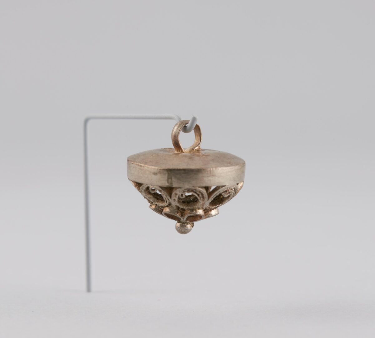 Gombík má pologuľovitý tvar, dno má z plechu, na ktorom je z hrubších a tenších drôtikov vytvorená rozeta, vrchol tvorí malá rozeta.