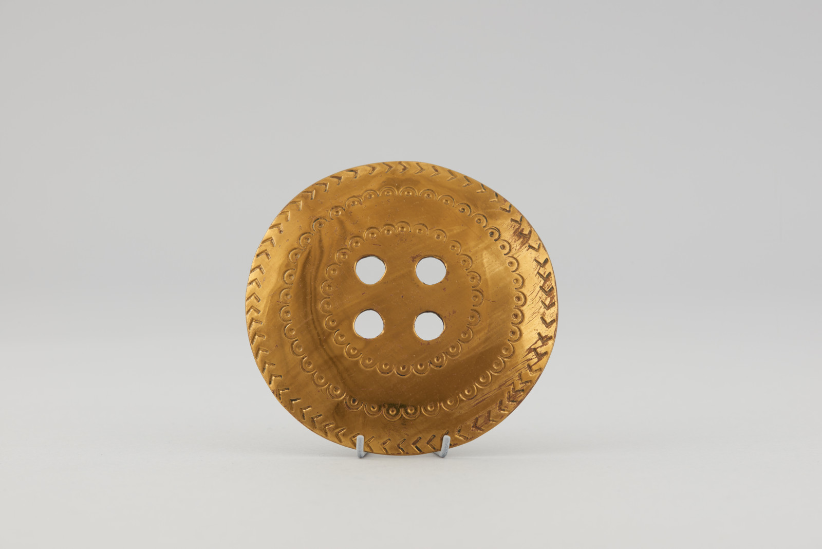 Mosadzný gombík – puklica – „šponga“ z okolia Tisovníka a Jesenského, zdobená raznicami. Dva rady poloblúkov s bodkou v strede, na okraji geometrický vzor „v“.