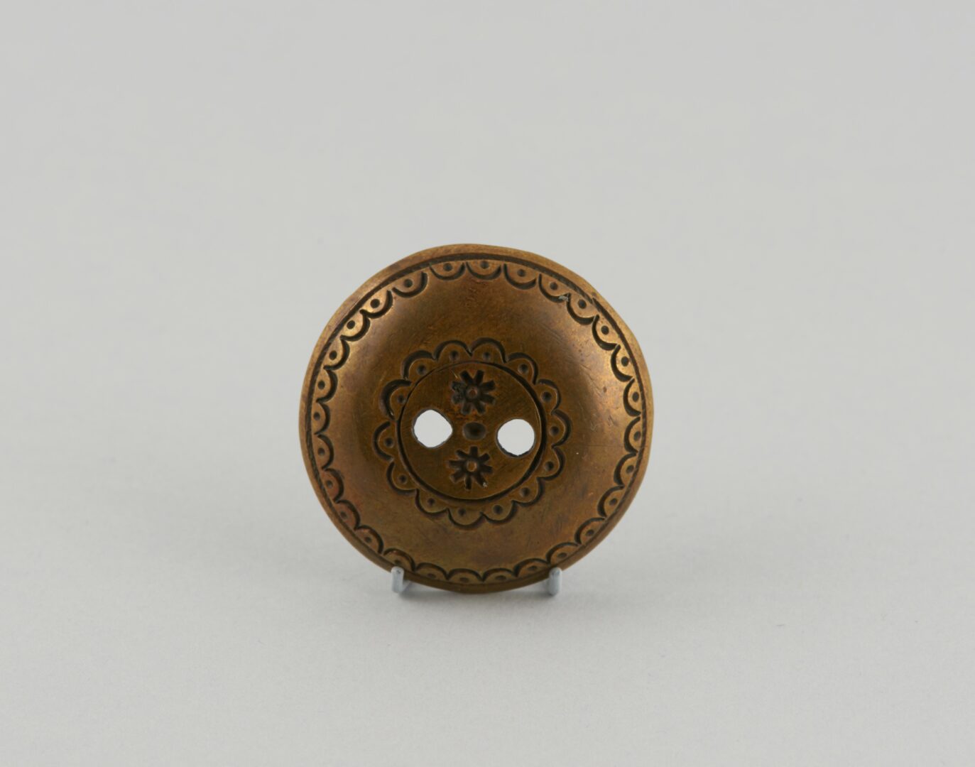 Gombík mosadzný, okrúhleho tvaru, vypuklý, uprostred s dvomi dierkami na prišitie. Výzdoba razená, uprostred popri dierkach v podobe dvoch roziet, okolo v podobe ozdobnej vlnovky, rovnako ako aj po obvode pri okraji. Mosadzný gombík s dvoma dierkami v strede, zdobený razením kvietkov, poloblúčkov s bodkami. Vypuklý tvar.