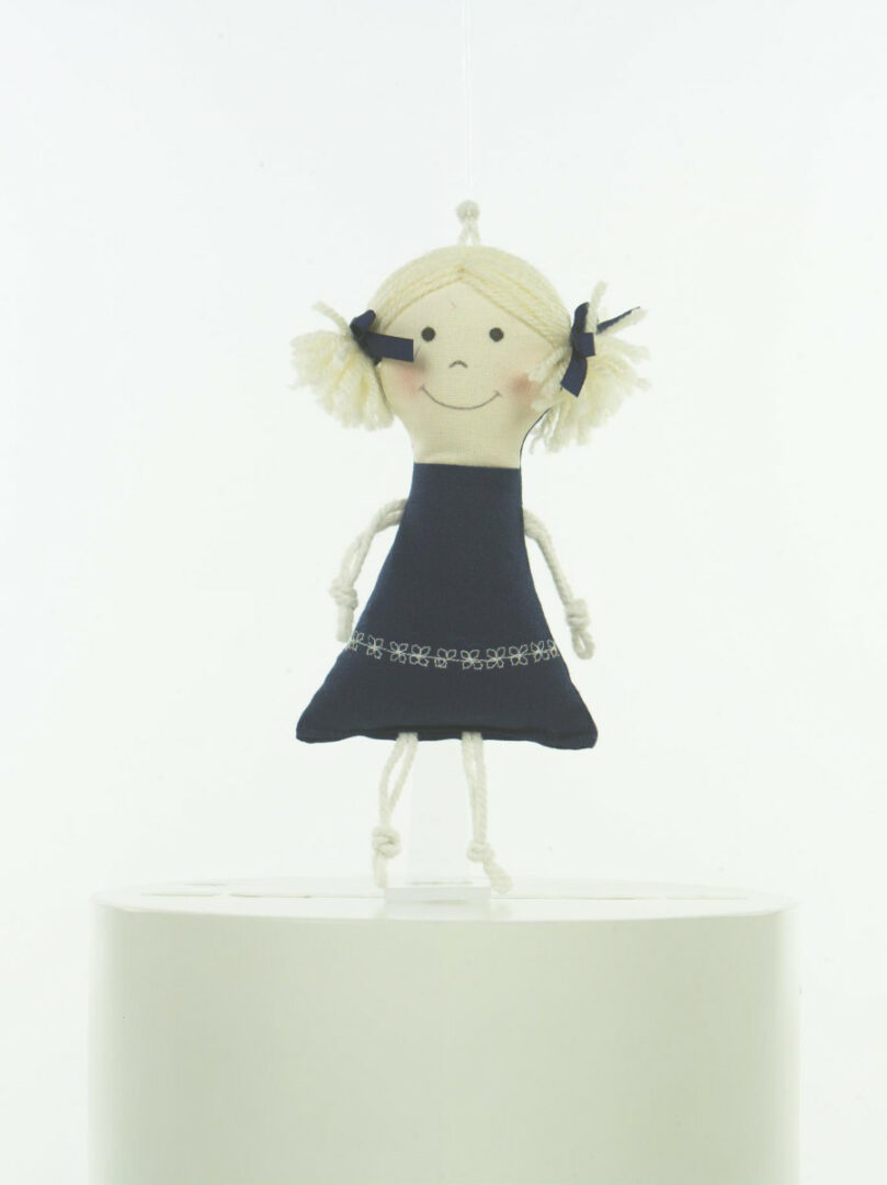 Textilná hračka – bábika ušitá z modrého a bieleho plátna, vyplnená vatou; vlasy, ruky a nohy sú z vlnenej priadze. Autor a realizátor: Hana Václavíková, Dunajská Lúžna