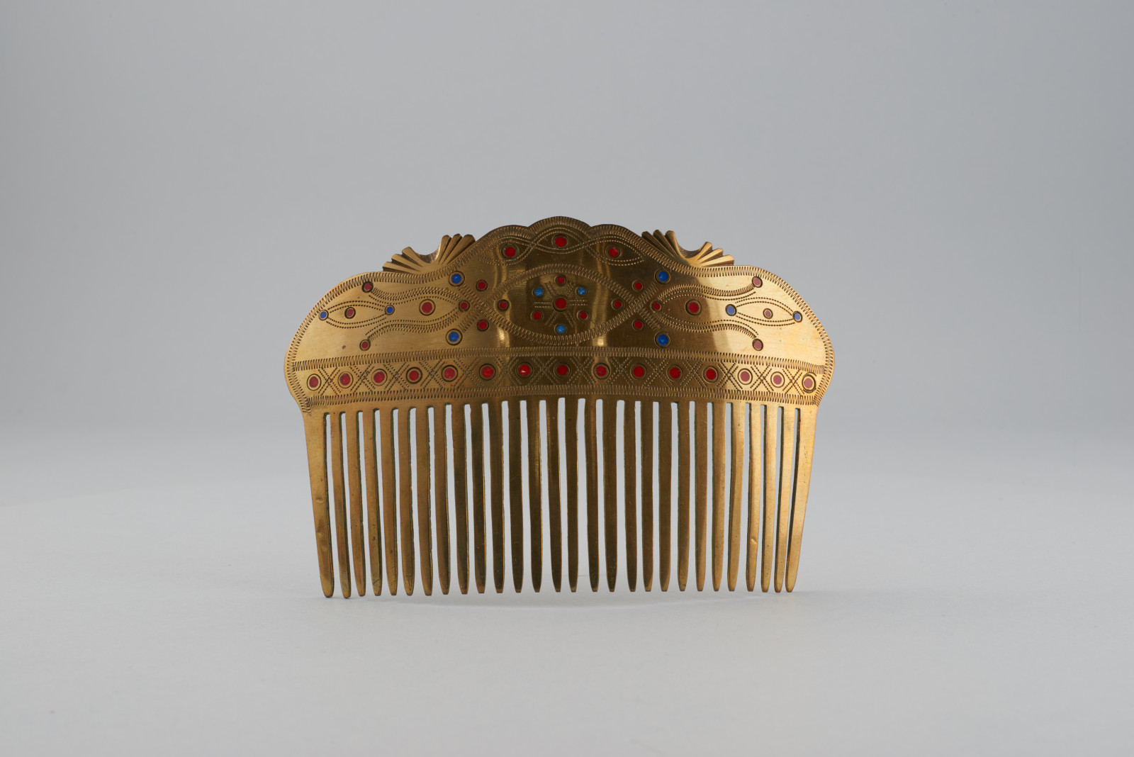 Hrebeň zhotovený z mosadzného plechu, oblúková časť na držanie má ozdobne profilovaný okraj a je zdobená razenými geometrickými motívmi doplnenými červenými a modrými bodkami. Zuby hrebeňa lemuje horizontálny pás červených bodiek.
