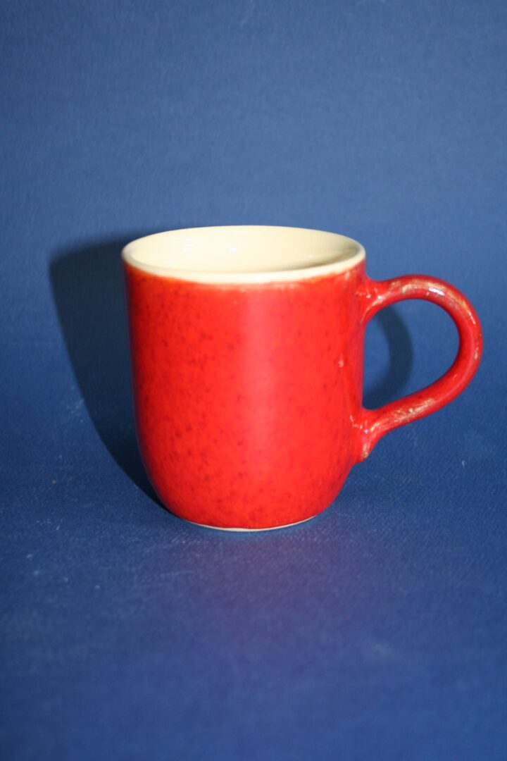 Ručne točený na hrnčiarskom kruhu z bielej hliny, zvnútra transparentná, zvonka farebná glazúra červená, žltá, oranžová, alebo modrá.