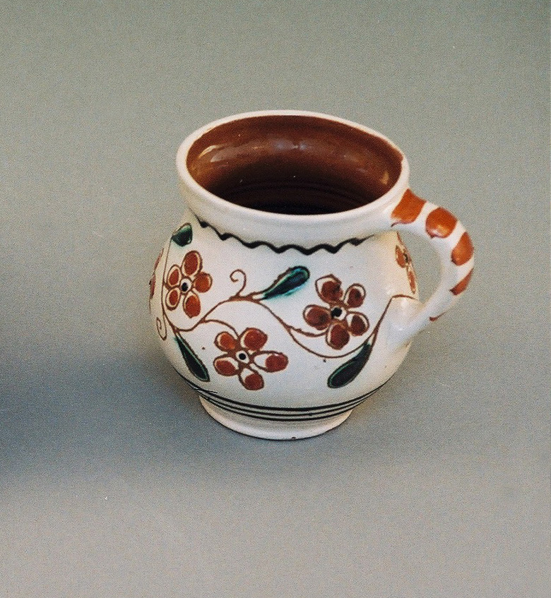 Točený na elektrickom hrnčiarskom kruhu,ucho lepené šlikrom, poliaty bielou hlinkou, maľovaný farebný a rytý dekor kvietky a lístky, transparentná bezfarebná glazúra.
