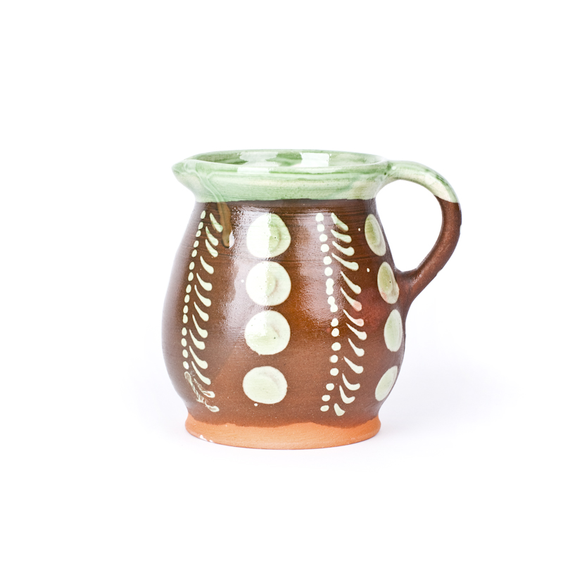 Ručne točený na hrnčiarskom kruhu, zdobený bielou hlinkou – bodky a linky kladené vertikálne v rade, zelená transparentná glazúra.
