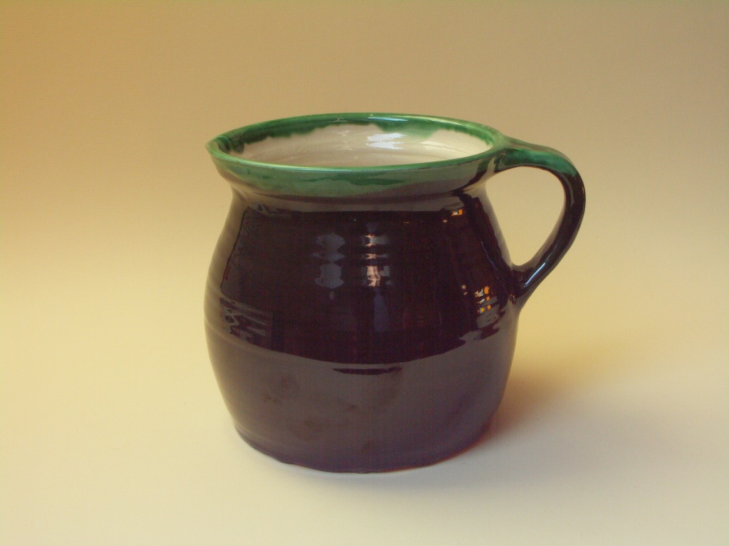 Ručne točený na elektrickom hrnčiarskom kruhu, zvnútra vyliaty bielou hlinkou a bezfarebnou transparentnou glazúrou, zvonka jednofarebná glazúra ( zelená, hnedá).