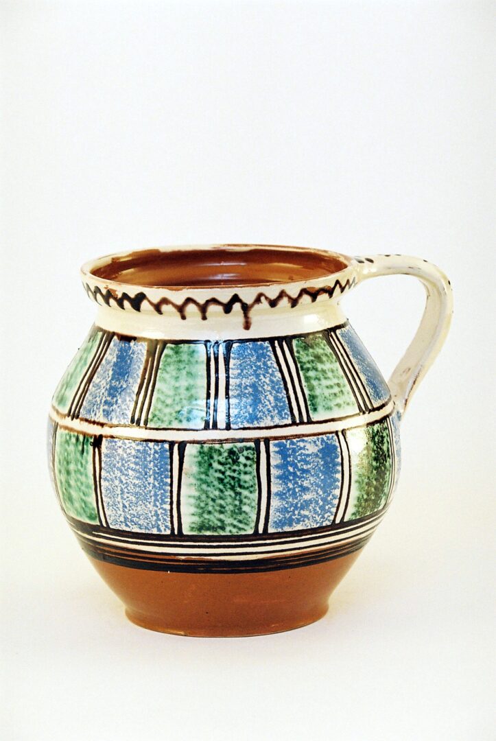 Ručne točený na hrnčiarskom kruhu, ucho lepené šlikrom, poliaty bielou hlinkou, pomocou kukučky (rožka) maľované horinontálne a vertikálne linky, ktoré predelujú plochu na obdĺžniky vyplnené nanesenou modrou a zelenou hlinkou hubkovou technokou, transparentná bezfarebná glazúra.