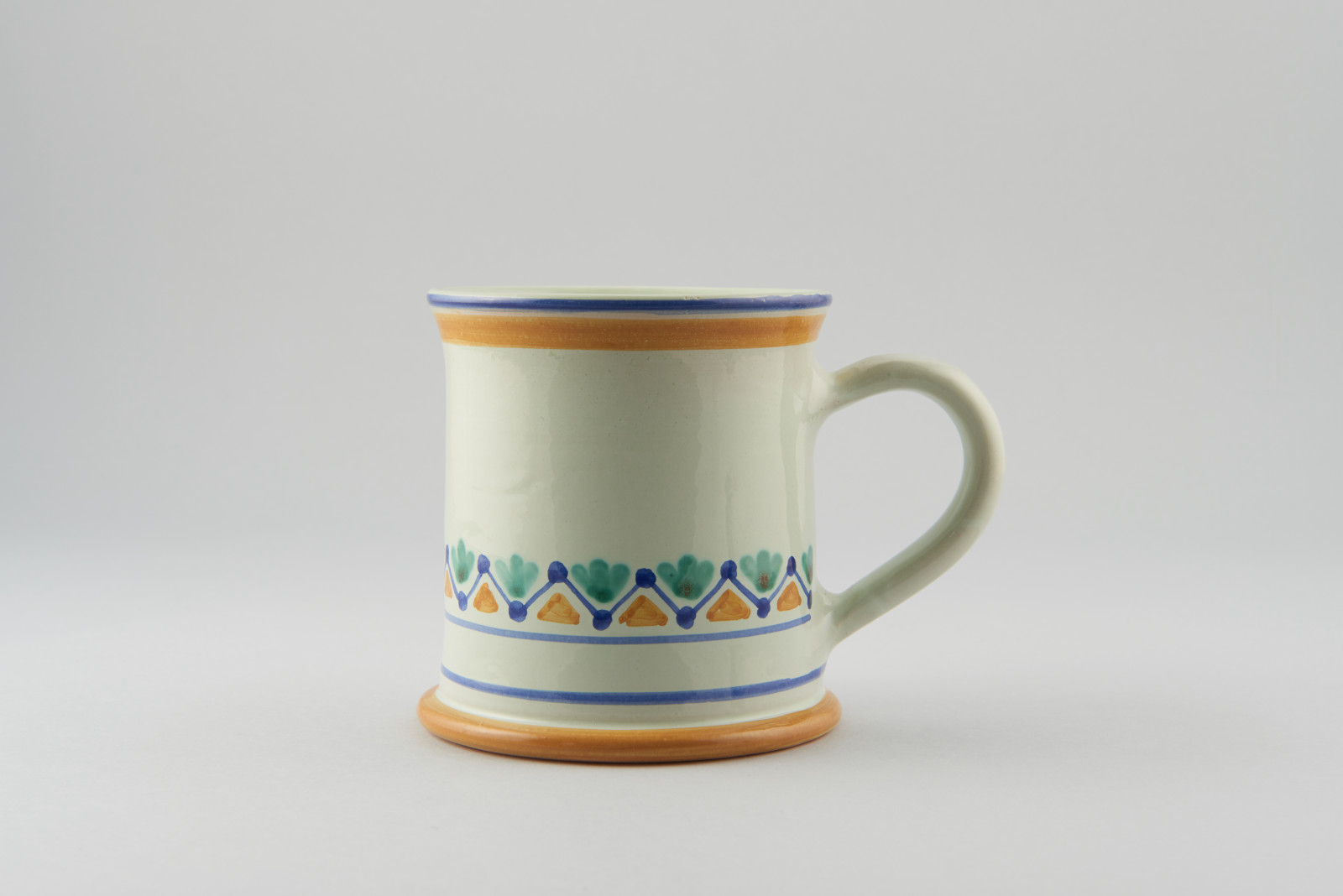 Hrnček keramický, majolikový, točený na kruhu, rovný tvar, ucho vychádza nižšie od okraja, dno je rozšírené. Dekor: dekoratívny pásik s geometrickým motívom v dolnej časti. Farebnosť: zelená, modrá, žltá, biela glazúra.