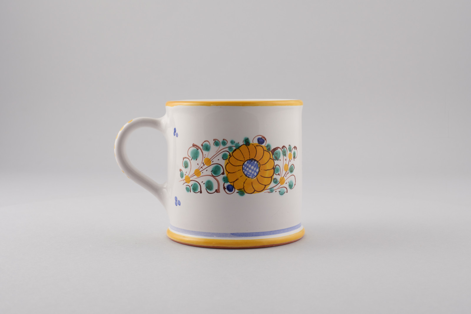 Hrnček majolikový, z červenej hliny, točený na kruhu, rovné steny, rozšírené dno, jedno uško vychádza nižšie od okraja. Dekor a farebnosť: po stranách dva žlté lupeňovité kvety s modrým stredom (slnečnice), okolo lístky, na okraji žltý pásik, na dne žltý a modrý pásik. Biela podkladová krycia glazúra. Značenie na dne: MODRA BB.