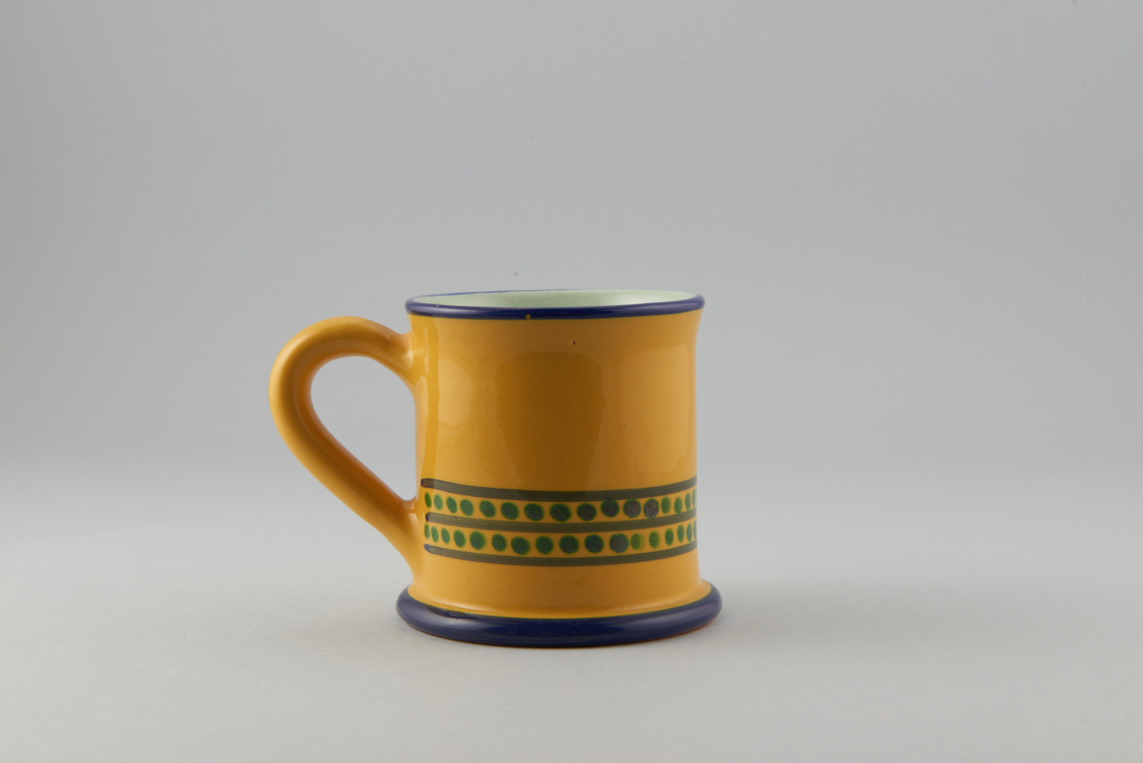 Hrnček keramický, majolikový, točený na kruhu, rovný tvar, ucho vychádza nižšie od okraja, dno rozšírené. Dekor: v dolnej časti dva pásiky s bodkami, na okraji a na okraji dna modré pásiky. Farebnosť: zelený a modrý dekor na žltom podklade. Vnútro: biela glazúra.