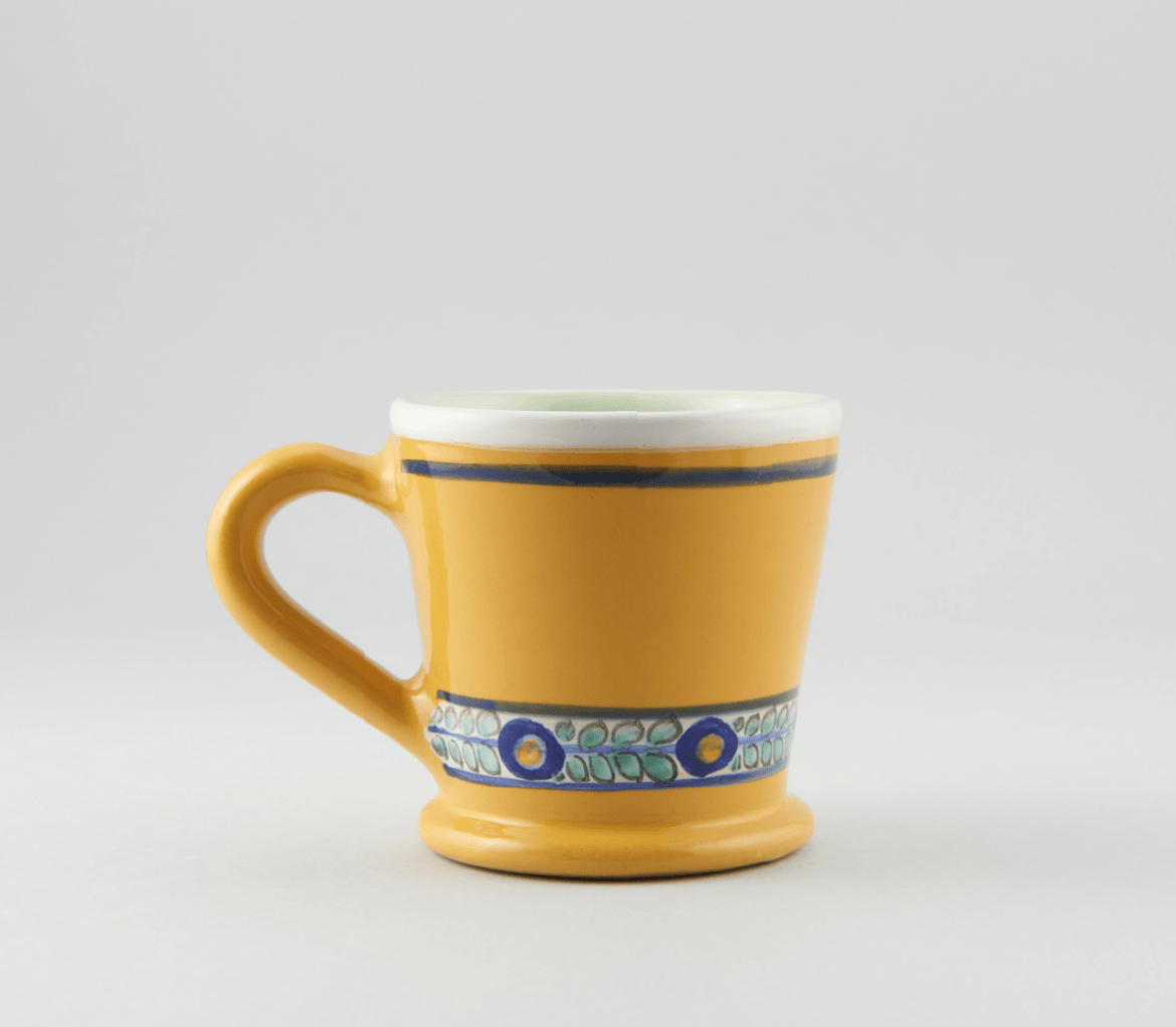Hrnček majolikový, z červenej hliny, točený na kruhu, rovný tvar, od okraja ku dnu sa zužuje, ucho vychádza zo steny nádoby /nižšie od okraja/, rozšírené dno tvorí podstavec. Dekor: v spodnej časti pás, v ktorom sú štylizované modré kvietky so žltým stredom a so zelenými lístkami /v tvare vetvičky/, pod okrajom modrý pásik. Z vonkajšej strany žltá glazúra, z vnútornej strany a na okraji biela glazúra.